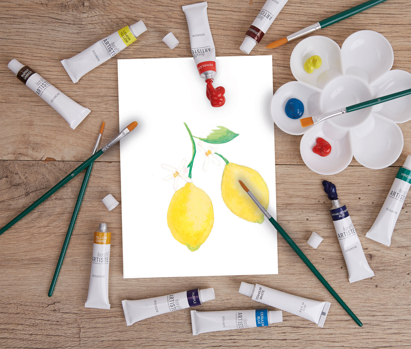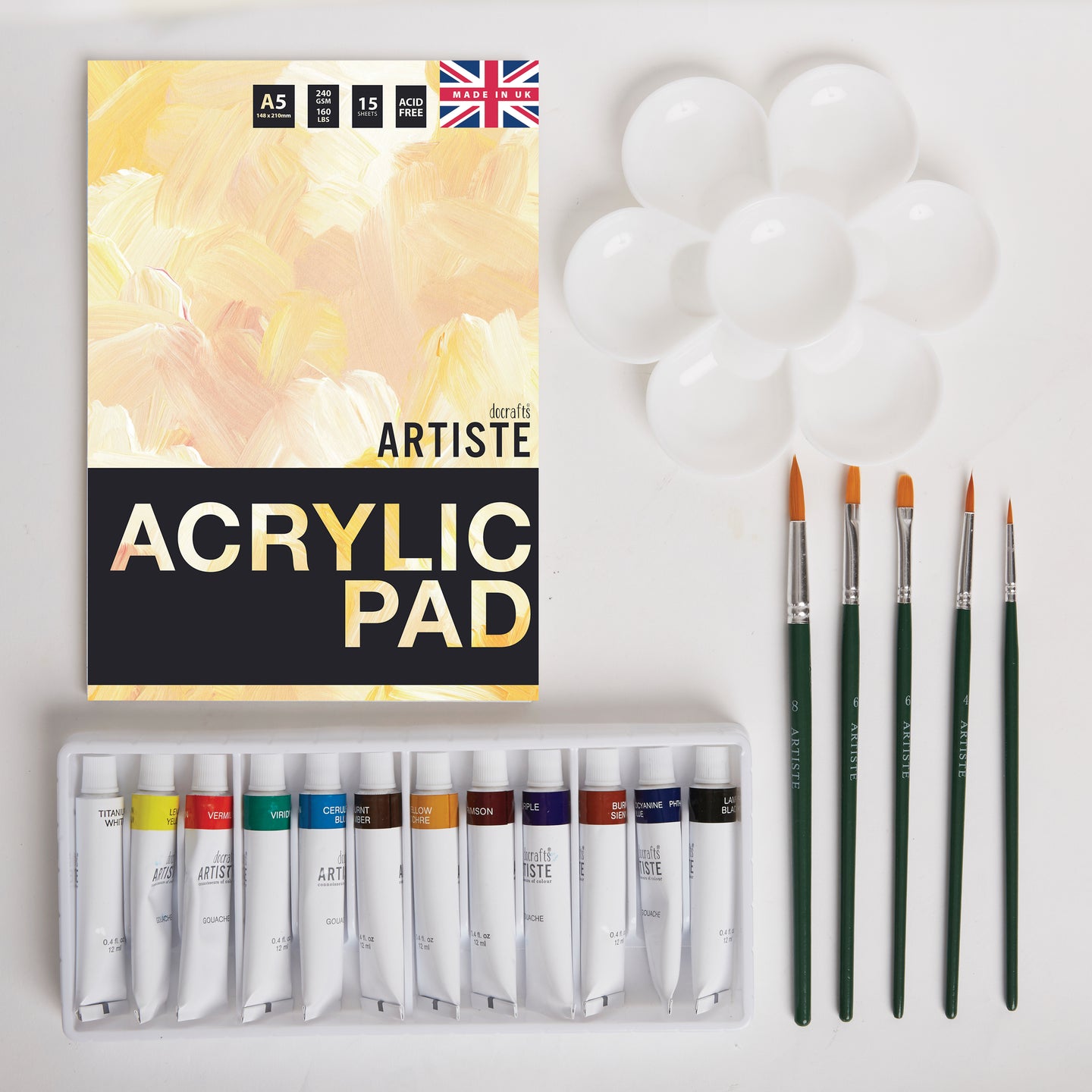 Discover your next favourite hobby. Gouache paints are like a more opaque watercolour, with a heavier texture, making them a great way to explore a variety of techniques and discover your own style. This set comes with the perfect selection of colours to get you started. You also get a variety of brush types that will give you the freedom to produce all types of work, a handy petal palette for mixing your colours and a high quality pad, with thick watercolour paper sheets. Contents includes, 12 Gouache Paints - 12ml, 5 Piece Brush Set, Petal Mixing Palette, A5 Watercolour Pad.