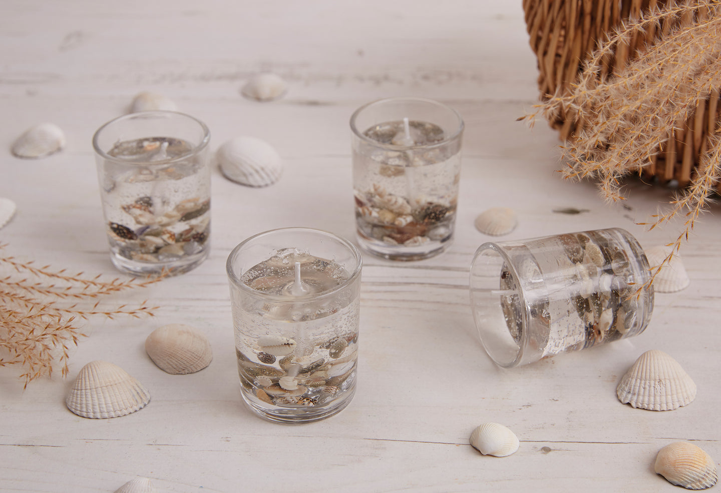 Make stunning clear gel candles. Using this lovely clear gel wax allows you to make candles that are really out of the ordinary, and a big talking point with friends and family. Decorate with shells and pebbles, and display in the four candle glasses. Contents includes Gel Wax, Candle Glasses, Wicks, Natural Shell Selection, Silver Pebbles and Instructions.
