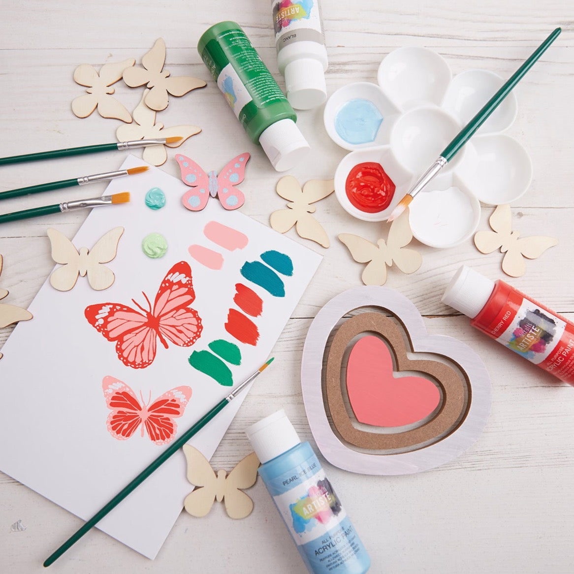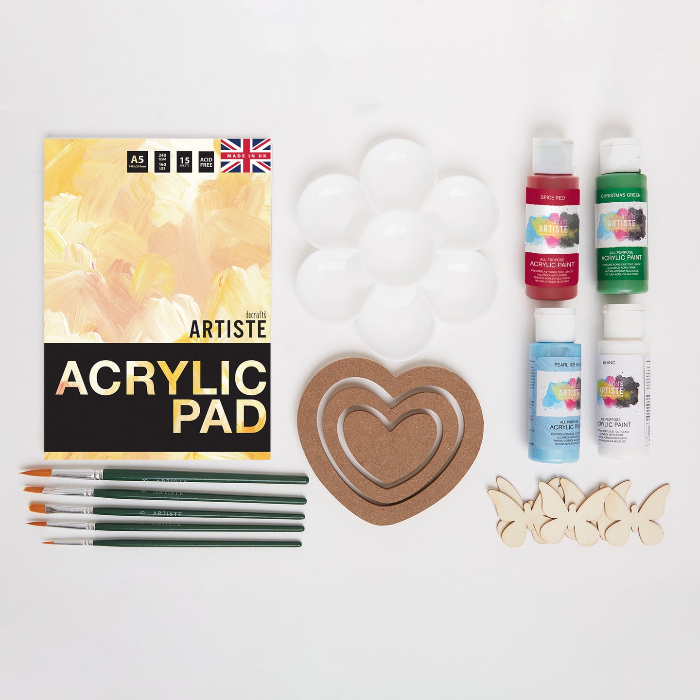 Embellish with your own painterly designs. Add a truly personal touch, decorating the wooden butterflies and hearts with the vibrant craft paints. Test out a few colour schemes and designs on the pad - the paper provided is especially suited to acrylics. Contents includes 4 pots of Acrylic paint - 57ml, 12 Butterfly Wooden Shapes, 3 Nesting Hearts, Paint Brushes, Petal Mixing Palette, and an A5 Acrylic Pad.