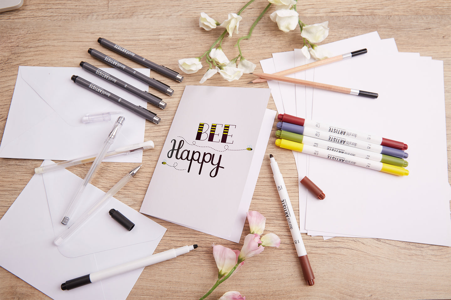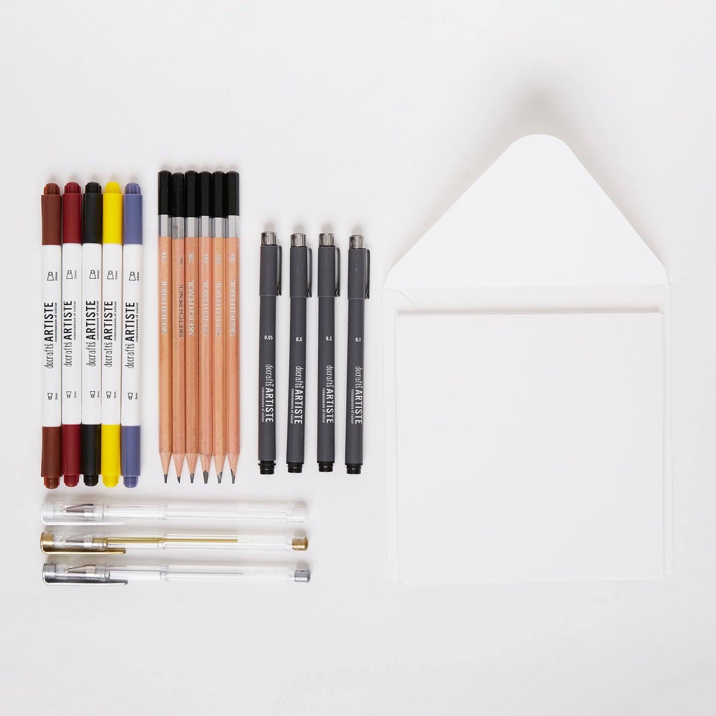 Make your messages look beautiful. It's easy to add some creative flair to your writing with the right pens. The flat nibs of calligraphy pens help you to form beautiful letters, that you can add flourishes to with metallic and fineliner pens. Then put your new skills to work, creating stunning personalised greeting cards to wow your nearest and dearest. Contents includes 6 Dual Tip Calligraphy Pens, 3 Metallic Gel Pens - Gold Silver & White, 4 Black Fineliner Pens - 0.05 to 0.5mm, 2 Pencils and 10 A6 Cards & Envelopes.