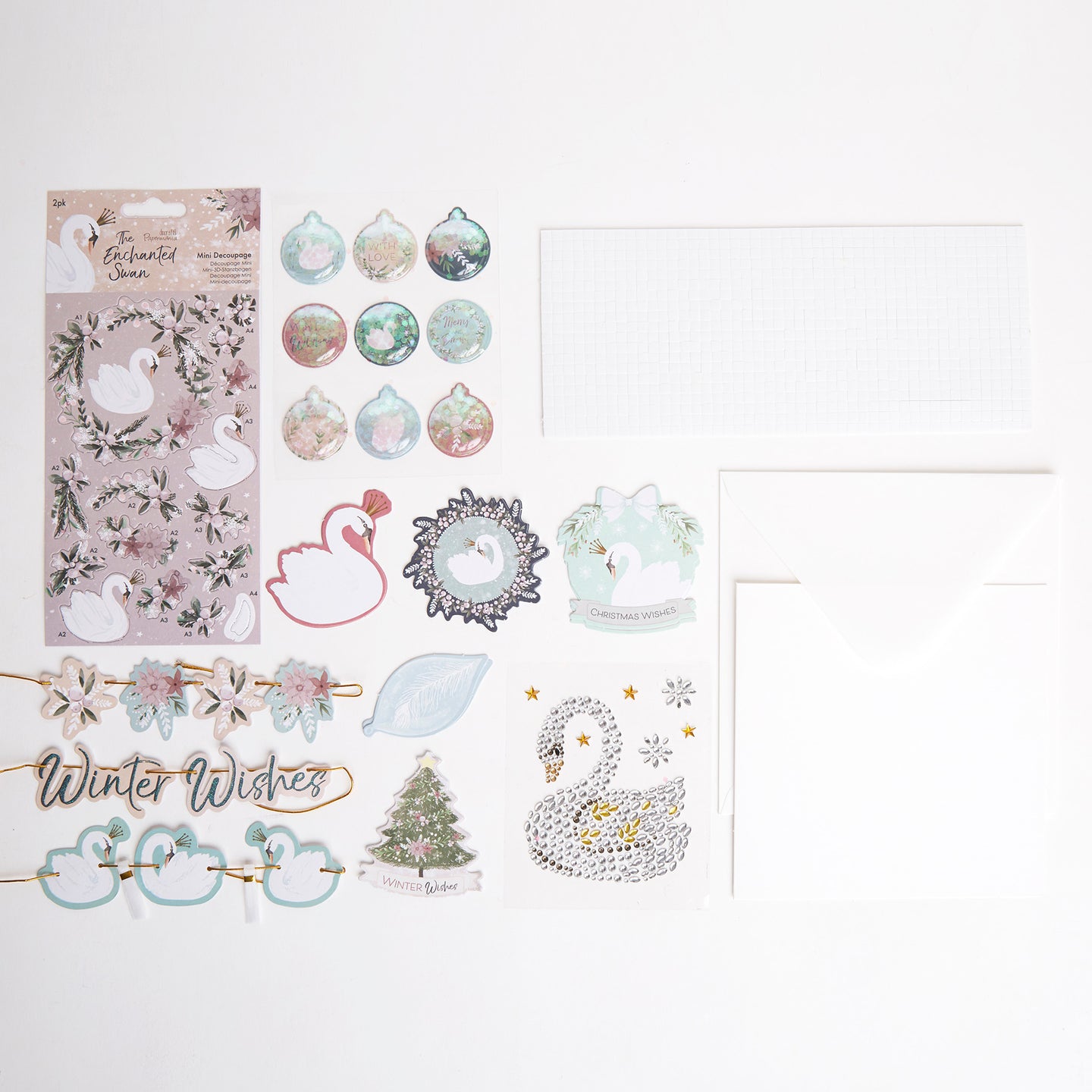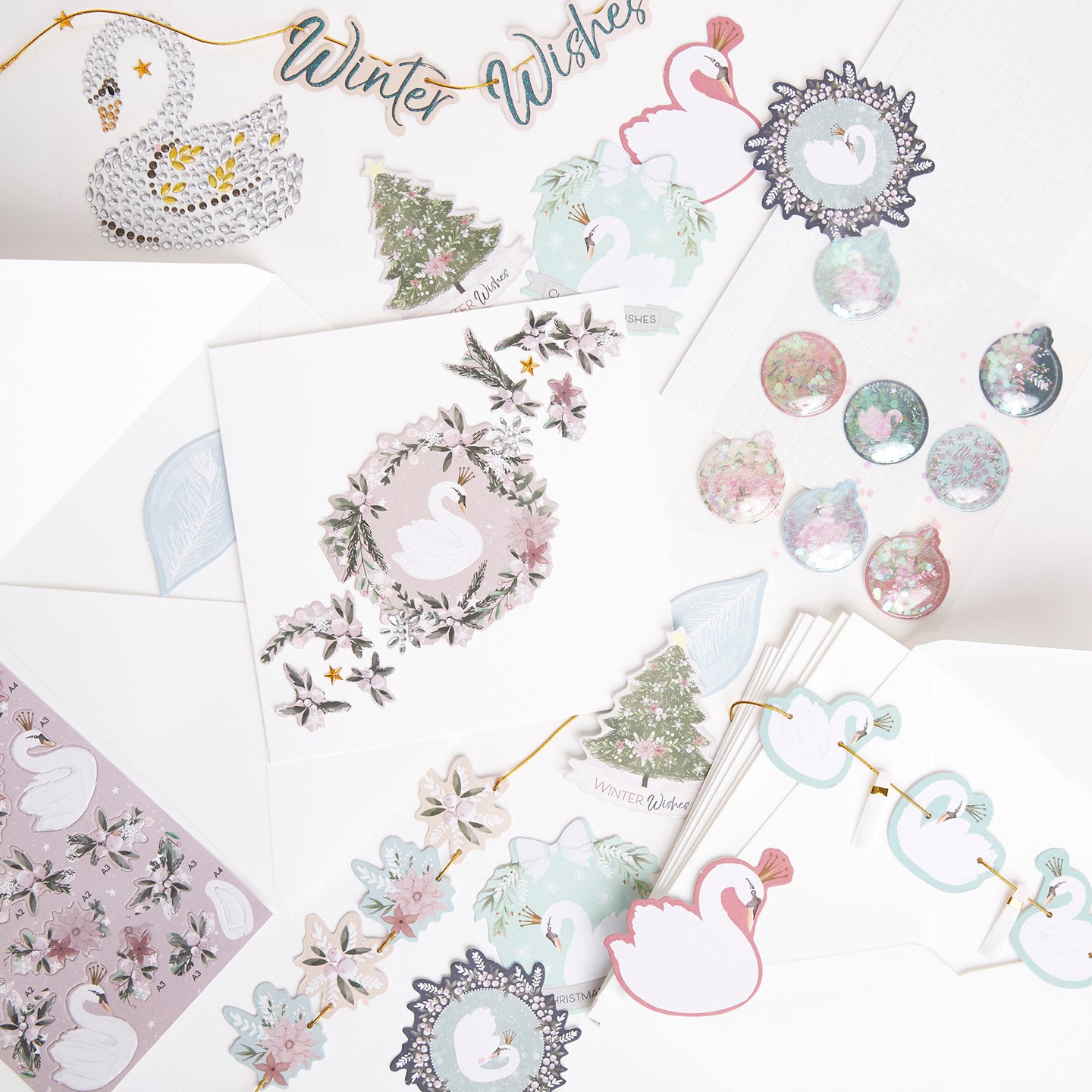 Embellish with the Enchanted Swan collection. Add a touch of magic to your papercrafts with this gorgeous Enchanted Swan selection. Evoking the fairy-tale wonder of The Swan Princess, this magical collection sparkles with white iridescent glitter. Feathers, florals, and snowflakes are rendered with a muted palette of pastel shades and patterns. Perfect for autumn and winter projects, or for sending loved ones magical Christmas sentiments. Contents include: mini garlands, die-cut toppers, mini 3D decoupage, 3D foam squares, dome stickers, large gem sticker, 10 cards & envelopes.