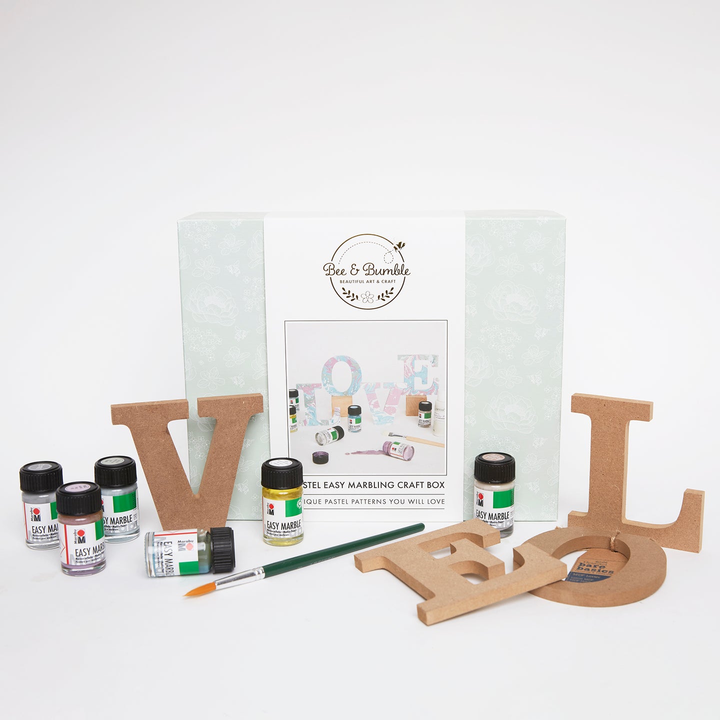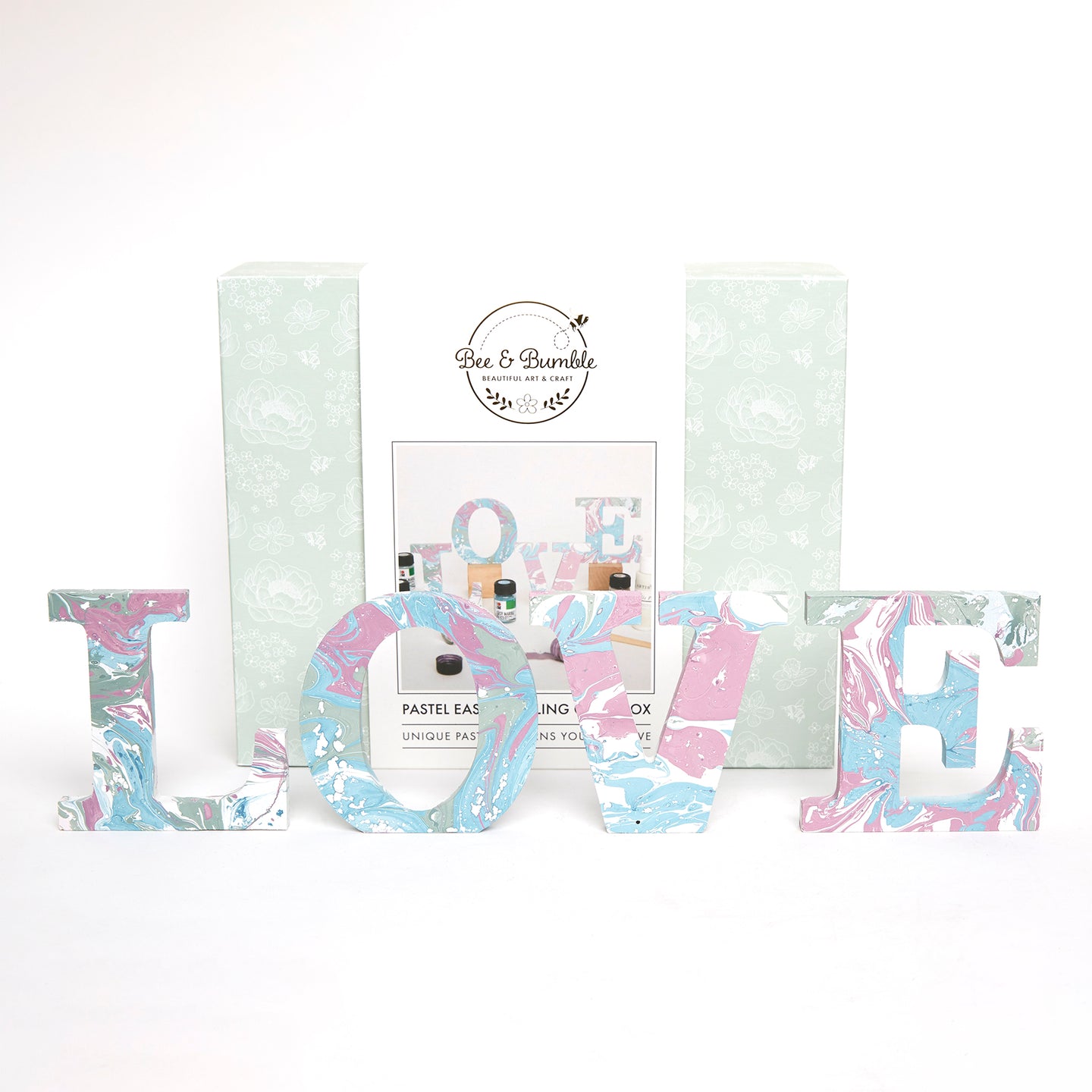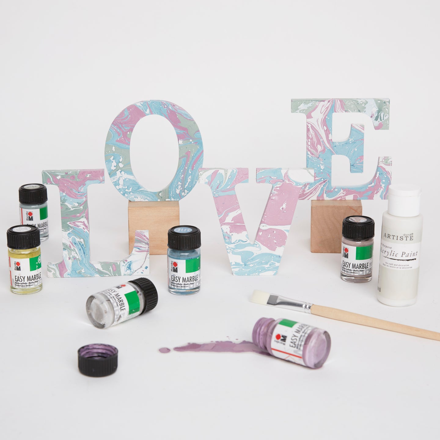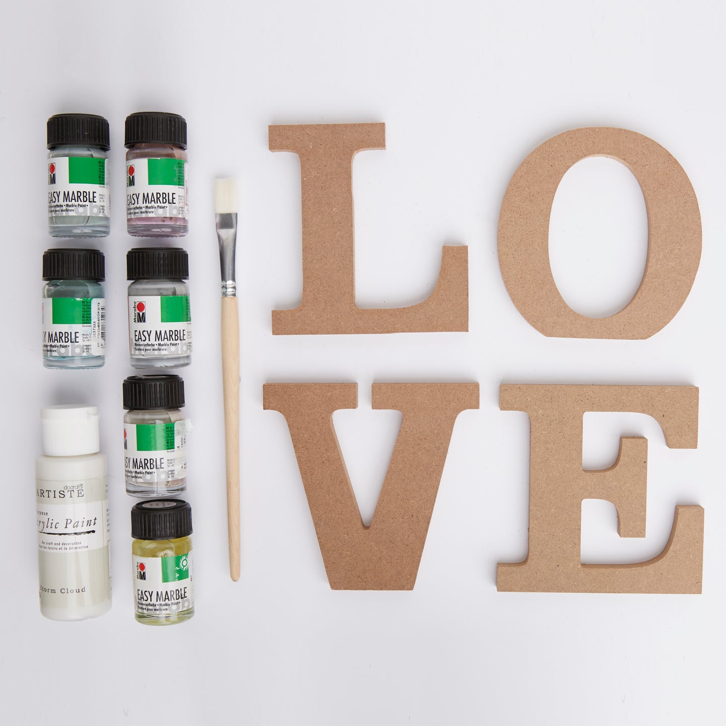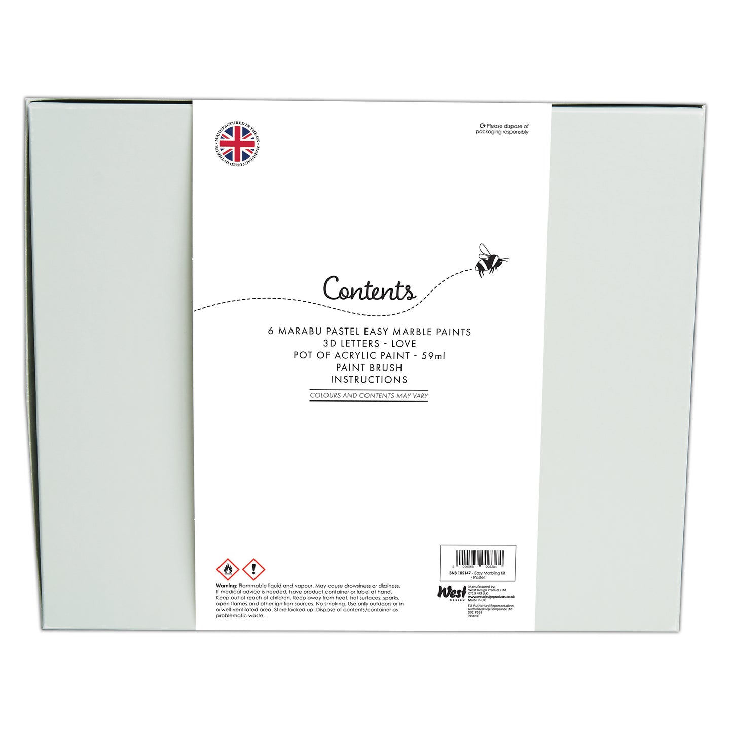 Unique pastel patterns you will love. A dream for all Fluid Art fans – marble effects with a delicate pastel note. The light pastel shades merge into a wonderful sea of colours and transform everyday objects into striking centrepieces. This kit has enough high quality Marabu paints to base coat and marble far more than the 3D letters included. Contents include: 6 Marabu Pastel Easy Marble Paints, 3D Letters - L O V E - 10cm, Pot of Acrylic Paint, Paint Brush, Instructions.