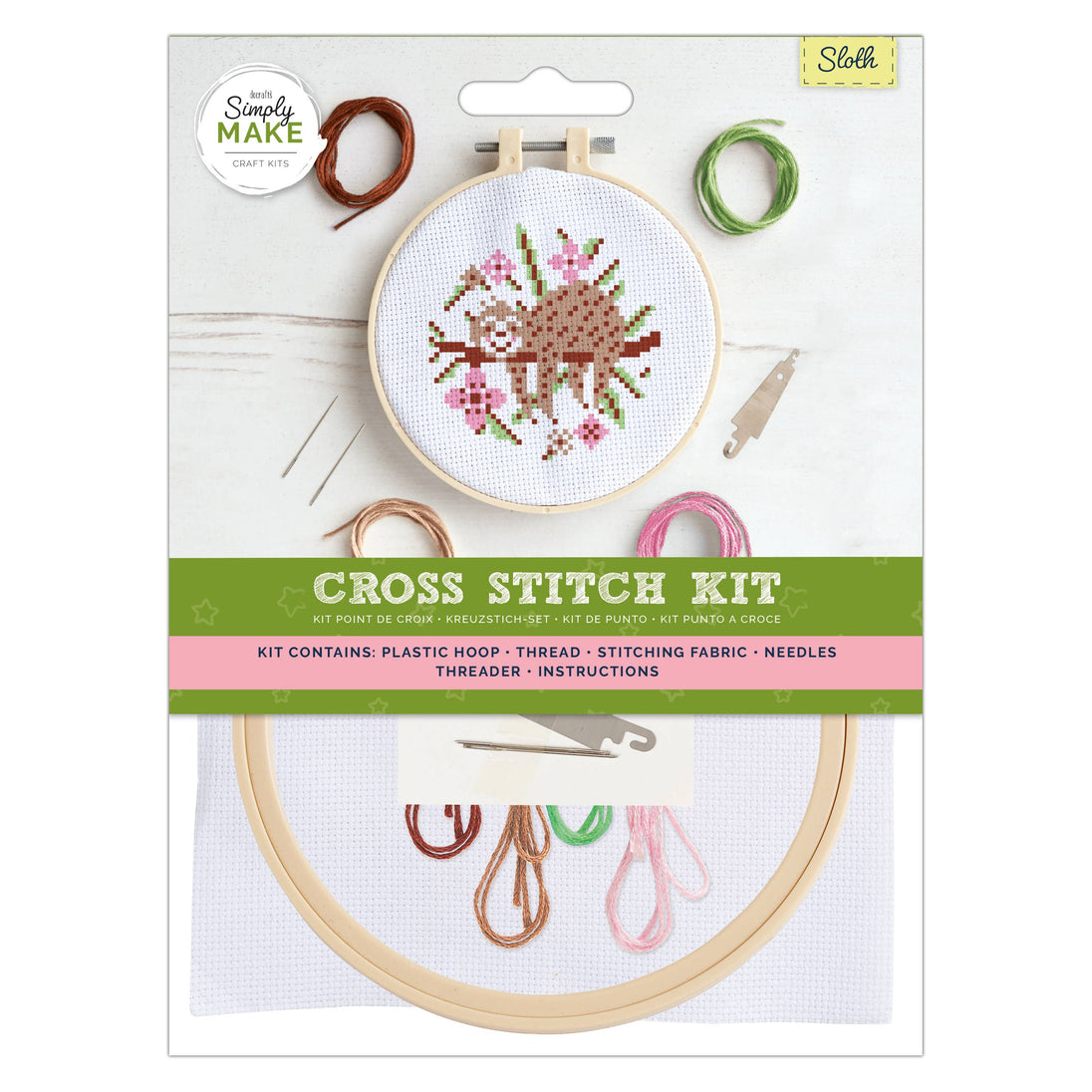 Simply Make Cross Stitch Kit - Sloth Design for Kids and Adults, Including Hoop, Embroidery Thread, Fabric and Needle - Perfect for Adult Crafts and Beginners - Starter Cross Stitch Craft Kit