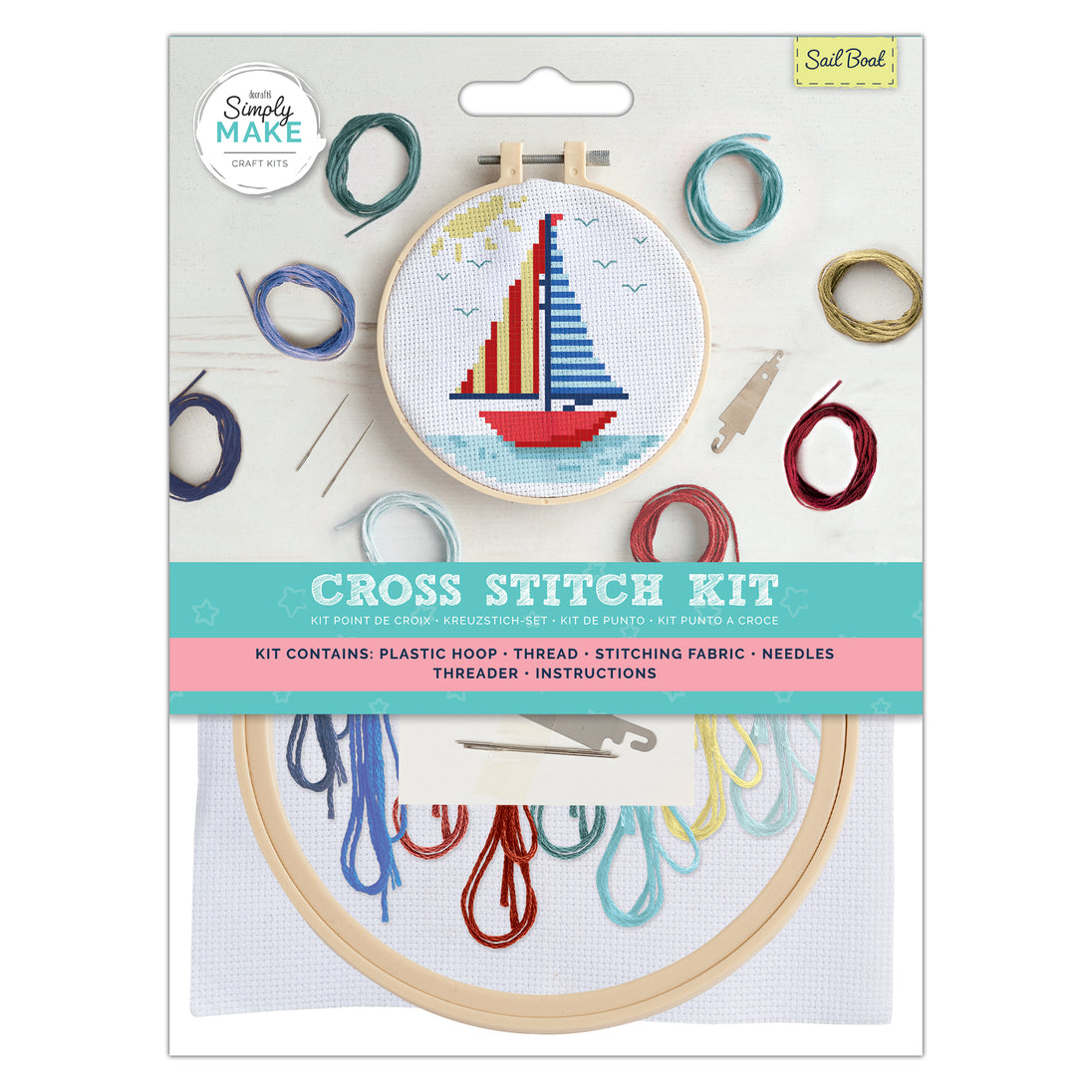 Simply Make Cross Stitch Kit - Sail Boat Design for Kids and Adults, Including Hoop, Embroidery Thread, Fabric and Needle - Perfect for Adult Crafts and Beginners - Starter Cross Stitch Craft Kit