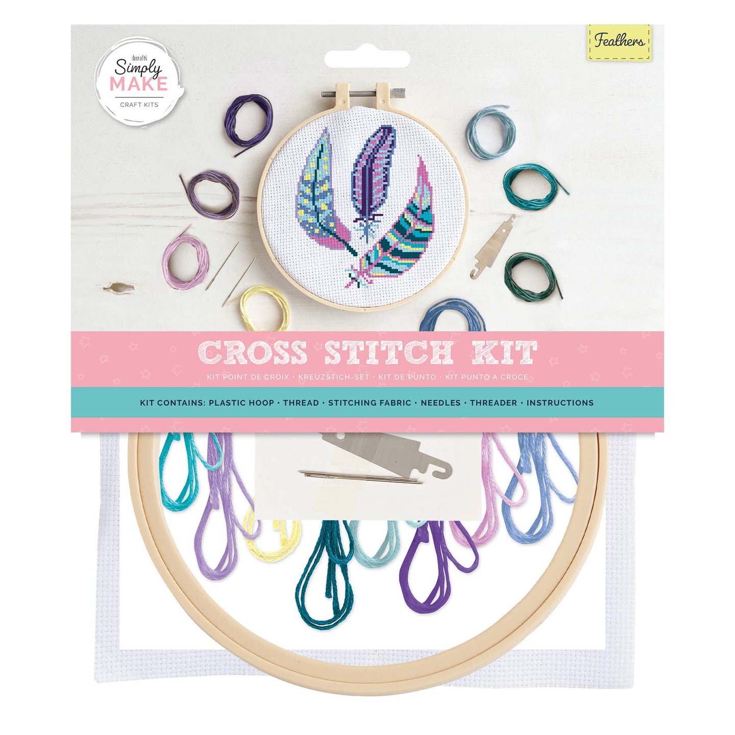Simply Make Cross Stitch Kit - Feathers Design for Kids and Adults, Including Hoop, Embroidery Thread, Fabric and Needle - Perfect for Adult Crafts and Beginners - Starter Cross Stitch Craft Kit