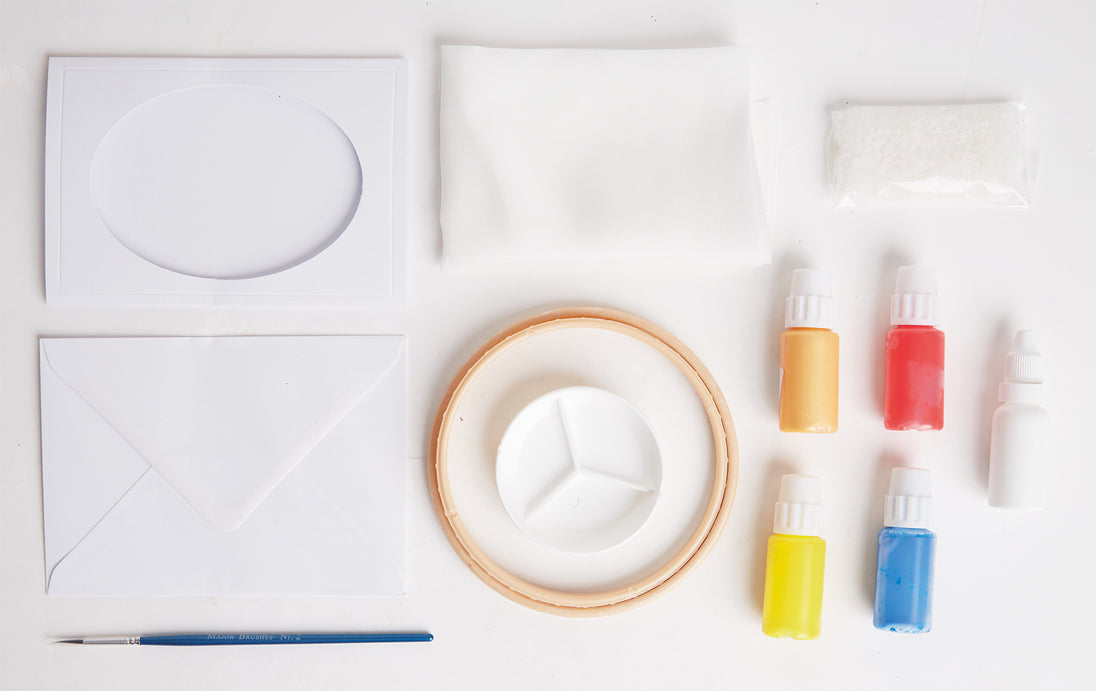 CONTENTS Kit includes silk paints (red, yellow, blue), natural silk, gold gutta outliner, card blanks/envelopes x 6, tension hoop, rock salt, artists brush, mixing palette, PVA adhesive, a set of instructions/patterns in English, French and Italian