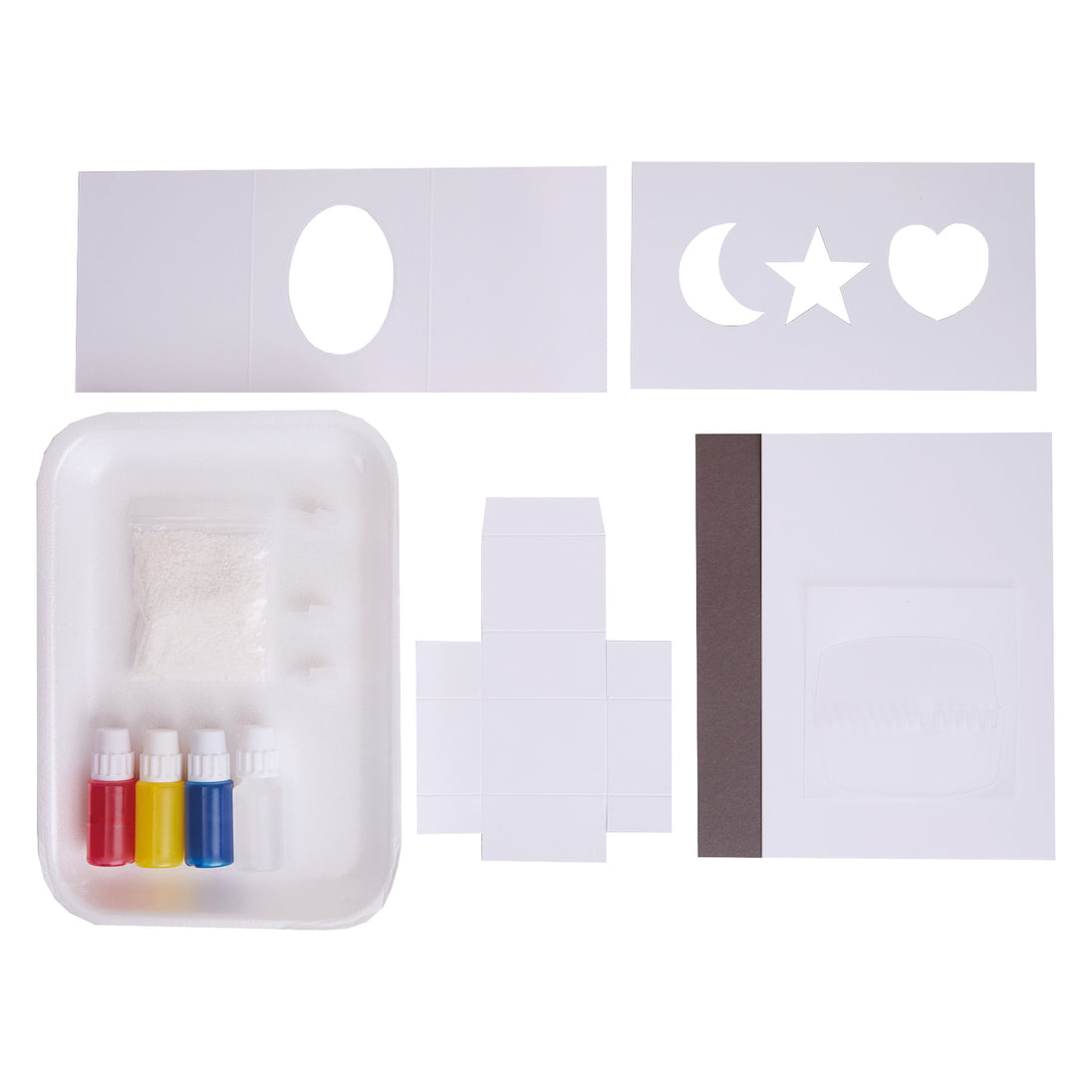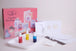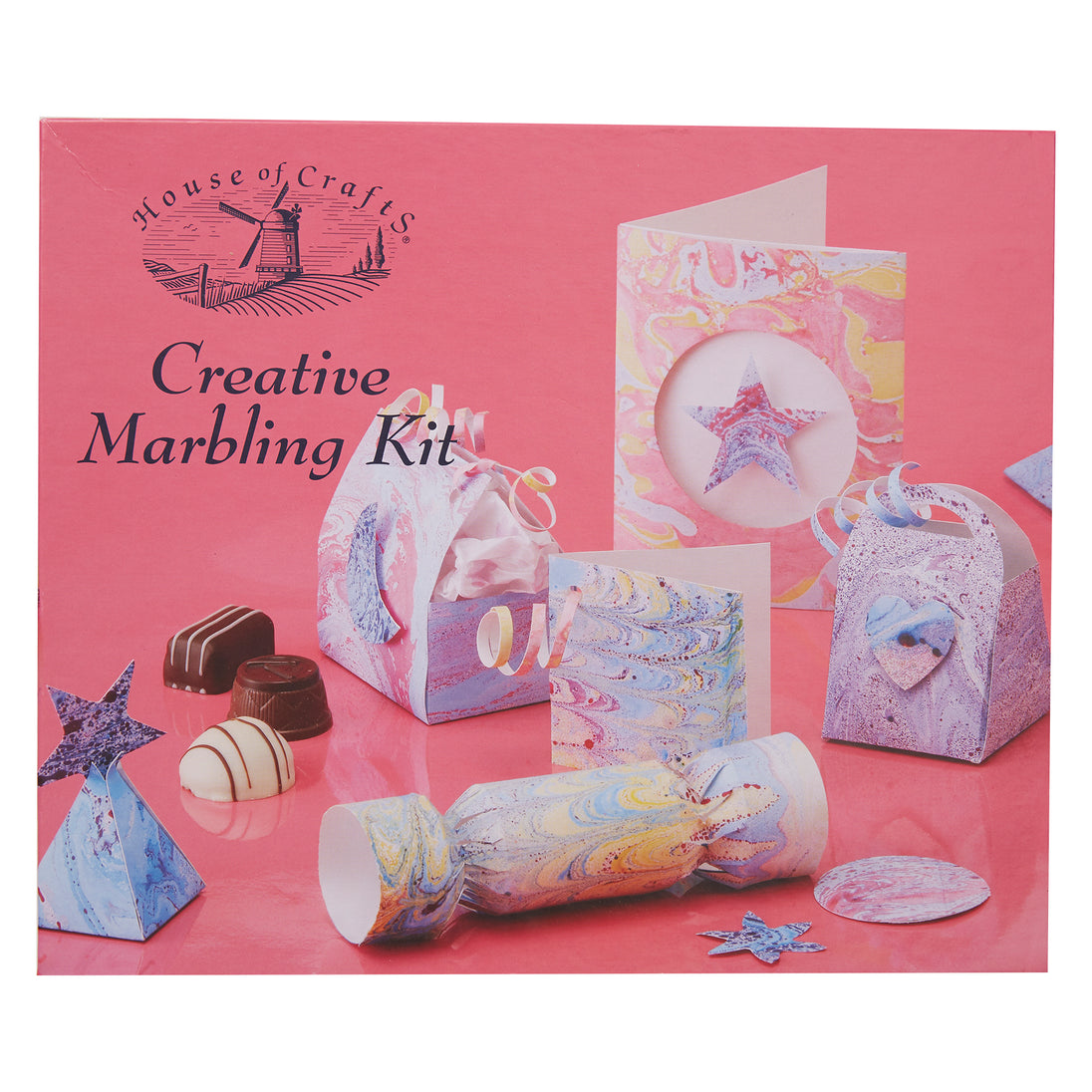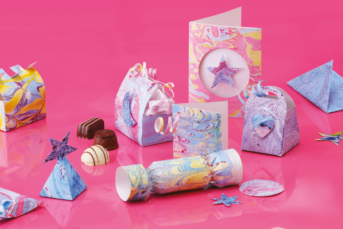 KIT Contains all the materials including marbling ink x3 colours, marbling tray, combing tool, plain card x20 sheets, greeting cards, trinket box blank, sachet of size, stencil, glue pen, and a set of instructions in English, French, and Italian