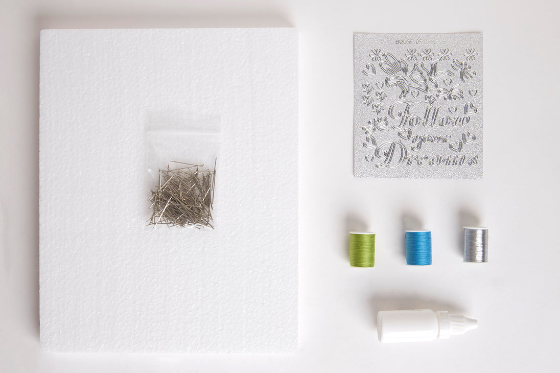 CONTENTS Pin art craft kit contains all the materials including threads x3 colours, pins, polystyrene base, black background card, backing board, self-adhesive embellishments and PVA adhesive along with a pattern sheet and instructions