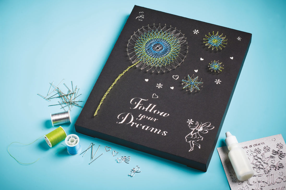 Create this fascinating and delicate dandelion clock design, using the traditional technique of pin and thread art. This innovative kit contains all the materials to create a delightful picture to brighten any room. Contents: Threads x 3 colours, pins, polystyrene base, black background card, backing board, self adhesive embellishments, PVA adhesive, pattern sheet and instructions (English/French/Italian)