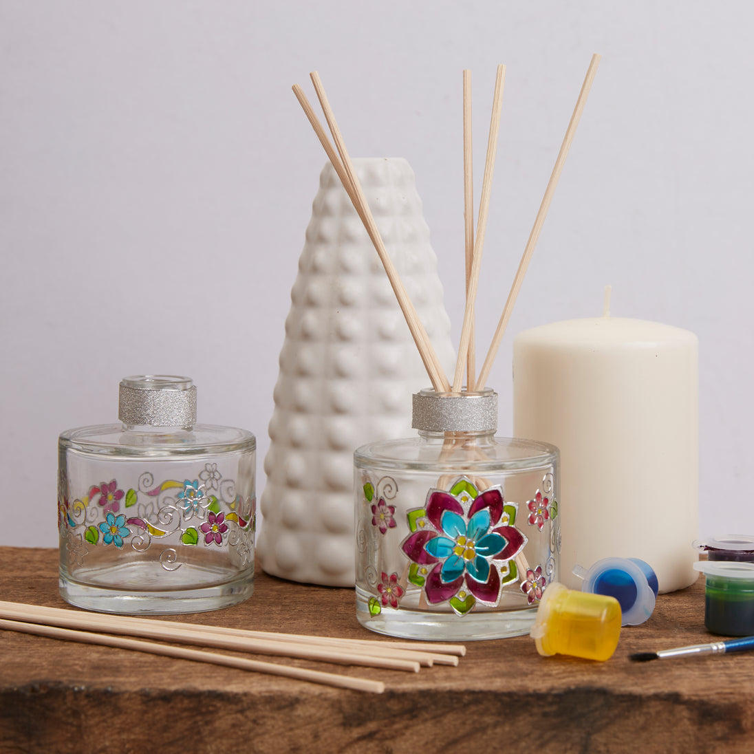 Painting on glass is an ever popular pastime. This superb kit offers an excellent introduction to glass painting and uses silver self adhesive outlines and glass paints to create two decorative glass fragrance bottles. Reed diffuser sticks are also included. Add your own fragrance to further personalise.