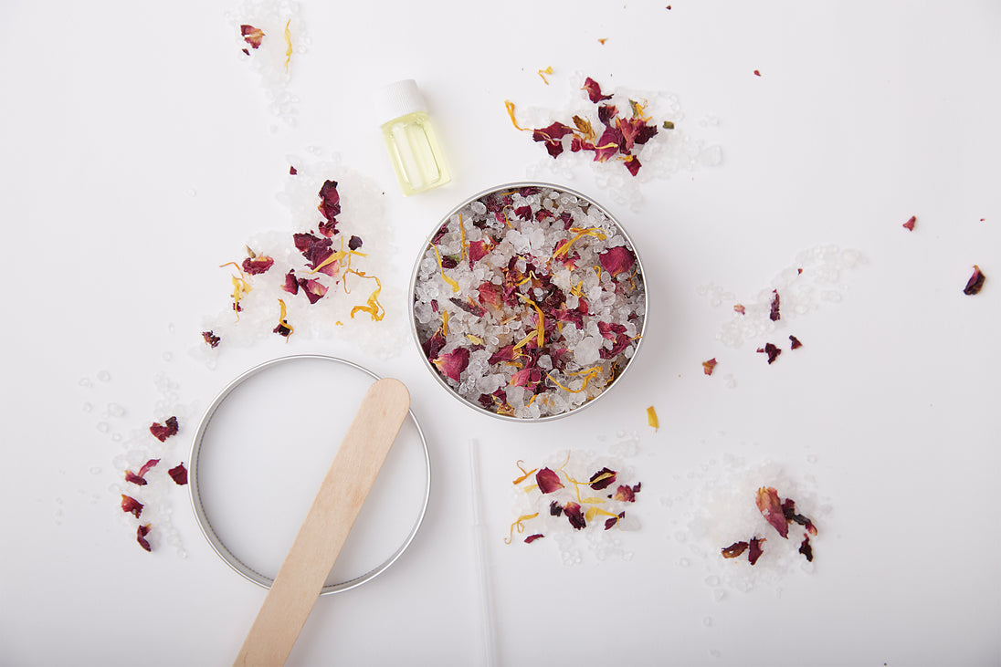 CONTENTS This kit contains all the materials required to produce stunning finished work including aluminium tin, 60g mineral sea salt, 60g Epsom salt, and 15ml castor oil, along with 5g dried marigold petals, 5g dried rose bud petals, 4ml rose fragrance oil, pipette, wooden stirrer, and a label
