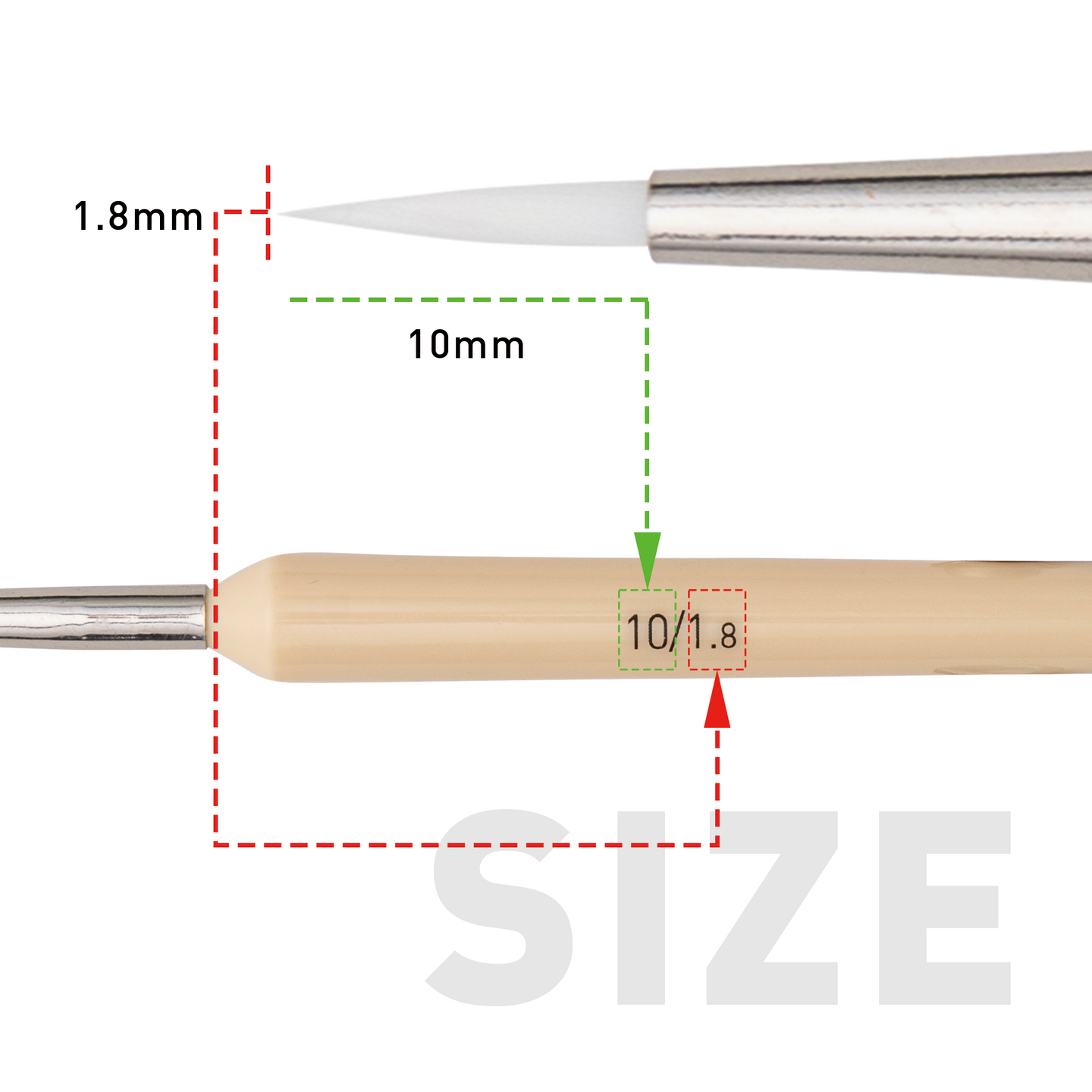 Made for artists with passion to details. This set includes five round liner brushes in different sizes, great for outlines, precize details, and straight long lines. The white Taklon hair is soft but springy, holds its shape well, and works well with gouache, acrylic, or watercolour. The plastic handles are light and strong, comfortable to hold, and don’t crack when wet. Each brush size is marked on the handle: for example, 10/1.8 means 10 mm hair length and 1.8 mm diameter. Metal ferrules keep the bristles firm and rust-free, so the brushes last long and stay reliable. The set comes in a lovely cardboard box, which can be used for storage and transportation. Care is simple: wash with green soap after use, shape the bristles gently with your fingers, let them dry, and store them in a brush or paint case. They’ll stay fresh and ready for your next creative session.