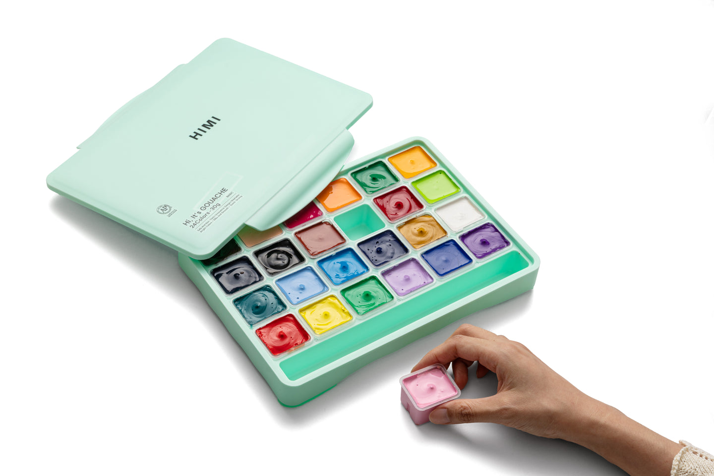 HIMI Jelly Cup Gouache Set 24 Paint Colours, Green Case, Add Water To Reactivate, Smooth, Rich Colours, Gift, Artist Art Supplies, Large Scale Art Work To Fine Details, Ready To Use Gouache Colors