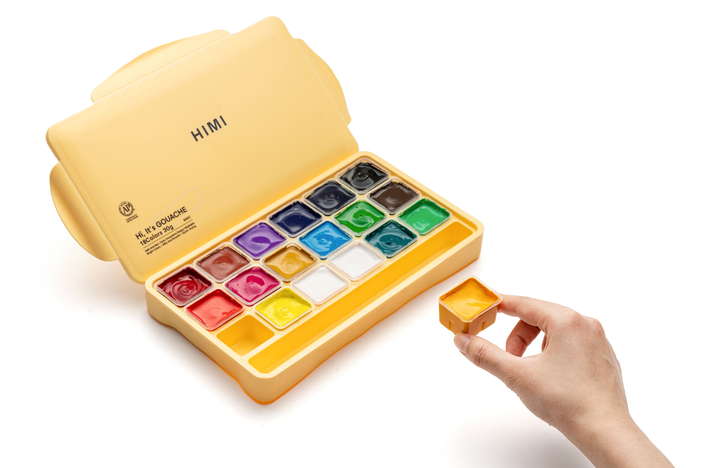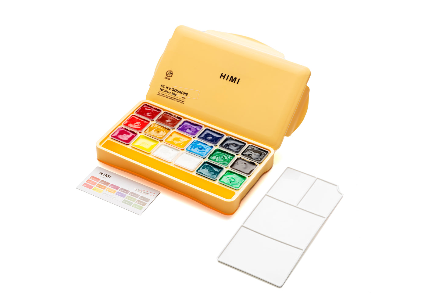 HIMI Jelly Cup Gouache Set 18 Paint Colours, Yellow Case, Add Water To Reactivate, Smooth, Rich Colours, Gift, Artist Art Supplies, Large Scale Art Work To Fine Details, Ready To Use Gouache Colors
