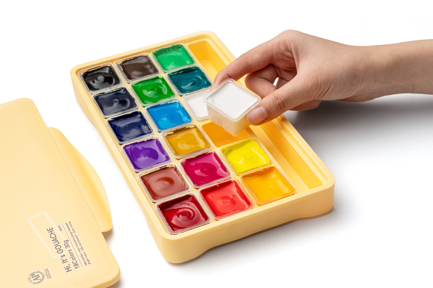 18 vibrant colours in a yellow case, opaque gouache paints ready for beginners and creative explorers alike. Paint without pressure. The HIMI Jelly Cup Gouache Set brings together 18 rich colours that stay bright and matte, never chalky or dull. Each colour is made with peach gum and fine pigments for a silky flow and smooth coverage on paper. Gouache reactivates with water, so nothing goes to waste. Just add a drop to bring colours back to life. Easy to clean, safe, and non-toxic, this set is as practical as it is inspiring. Tip: Pair this set with the HIMI Spray to keep paints moist and fresh for longer sessions. The compact yellow case keeps everything organised and portable, whether you’re painting at home, in class, or on the go. Grab your brush and you can start creating right away. Suitable for artists of every level who want to add colour to their world.