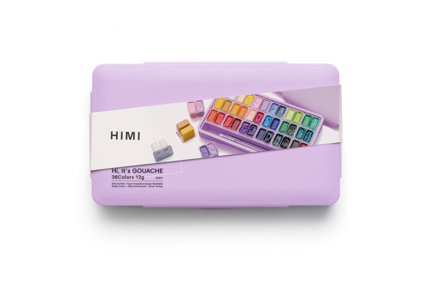 HIMI Twin Cup Gouache Set 36 Paint Colours, 3 Brushes, Paint Pallete, Purple Case, Add Water To Reactivate, Smooth, Rich Colours, Gift, Artist Art Supplies, Large Scale Art Work To Fine Details
