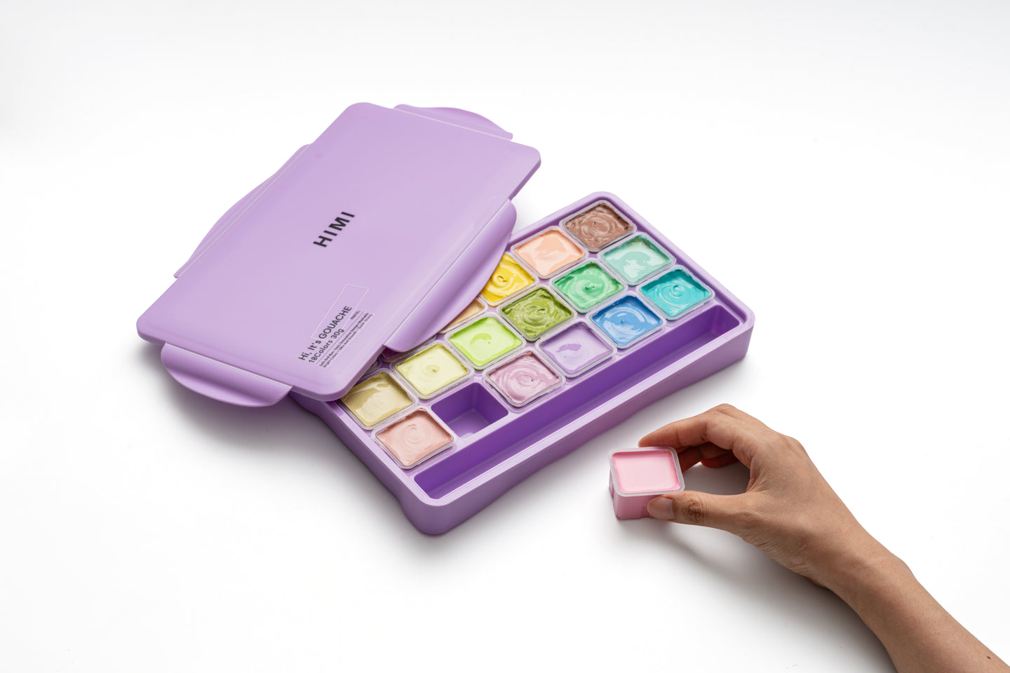 HIMI Jelly Cup Gouache Set 18 Paint Colours, Purple Case, Add Water To Reactivate, Smooth, Rich Colours, Gift, Artist Art Supplies, Large Scale Art Work To Fine Details, Ready To Use Gouache Colors