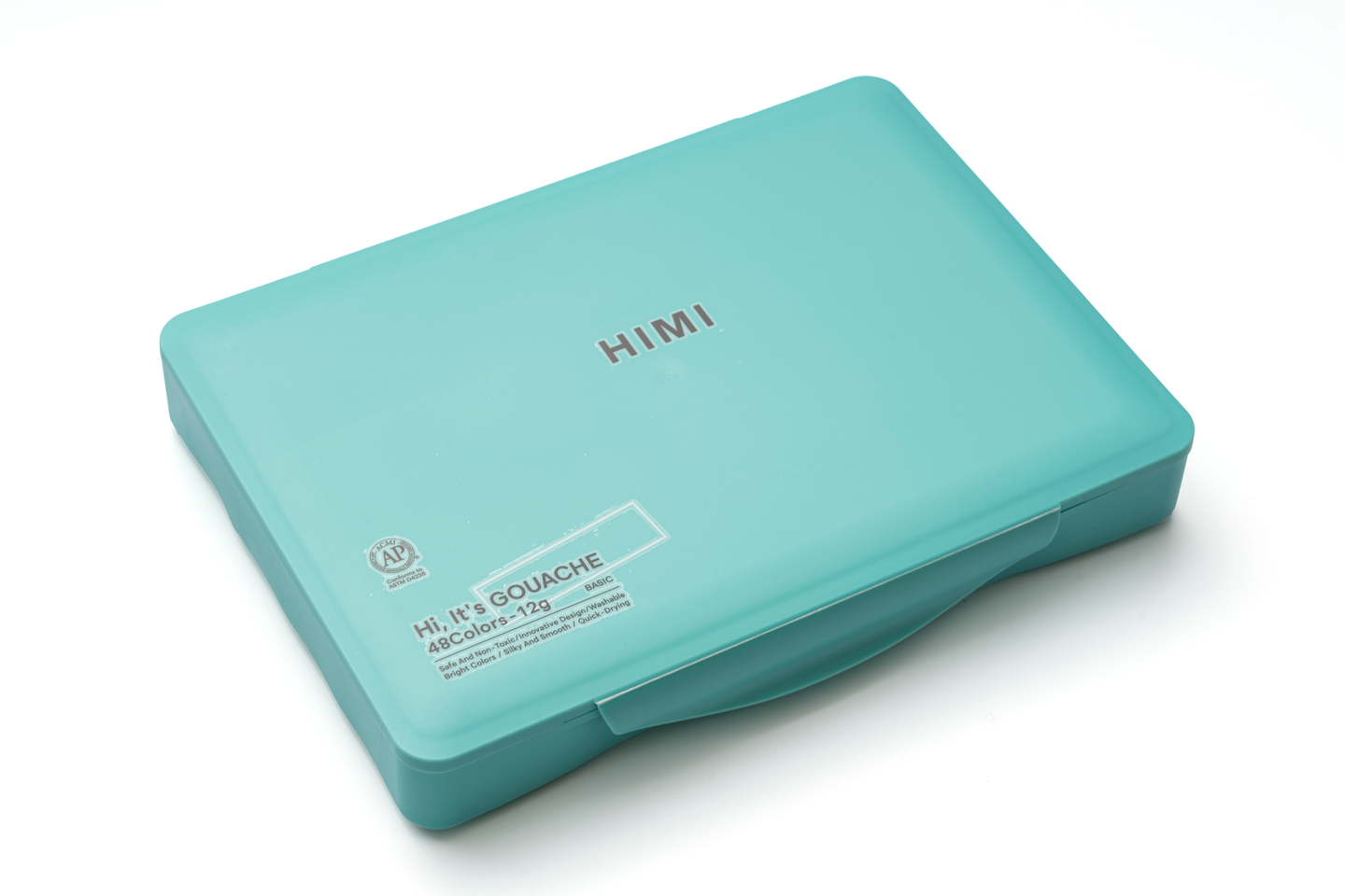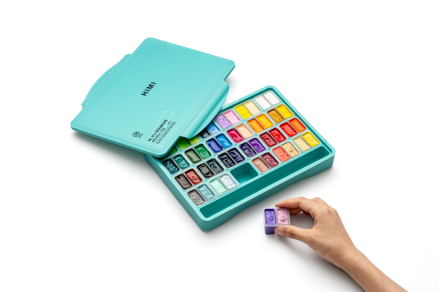 HIMI Twin Cup Gouache Set 48 Paint Colours, 3 Brushes, Paint Pallete, Green Case, Add Water To Reactivate, Smooth, Rich Colours, Gift, Artist Art Supplies, Large Scale Art Work To Fine Details