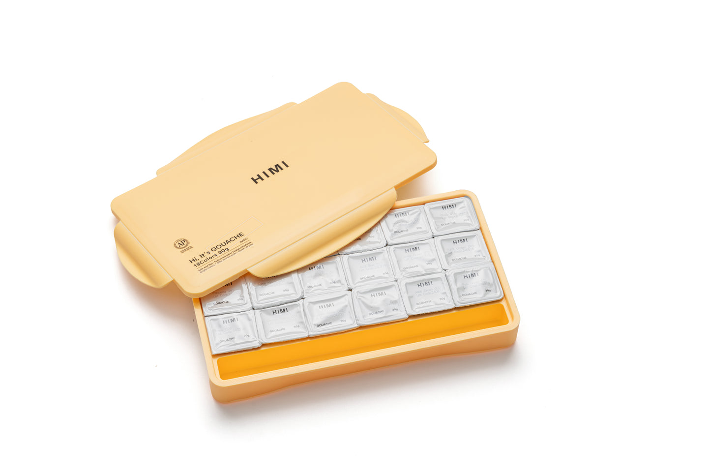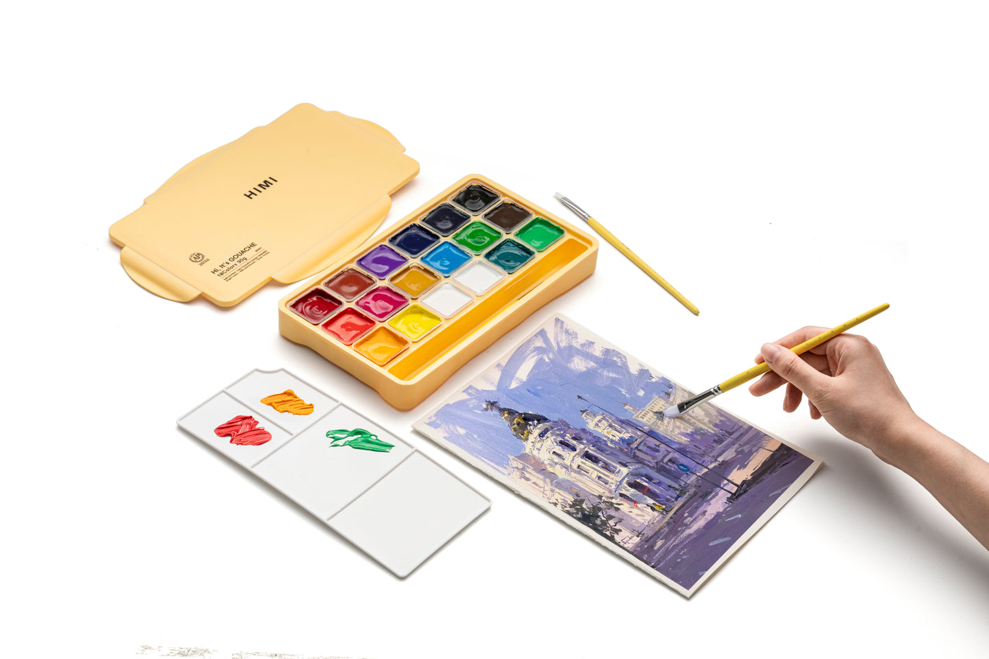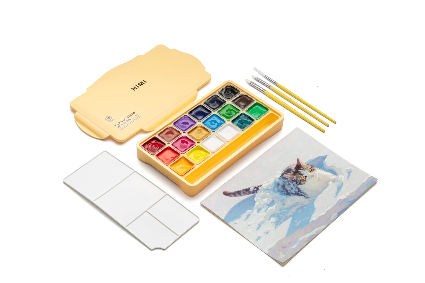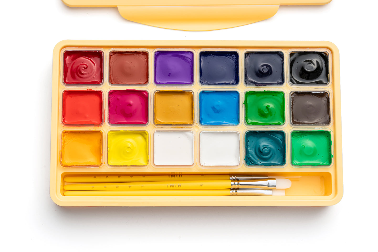 HIMI Jelly Cup Gouache Set 18 Paint Colours, 3 Brushes, Paint Pallete, Yellow Case, Add Water To Reactivate, Smooth, Rich Colours, Gift, Artist Art Supplies, Large Scale Art Work To Fine Details