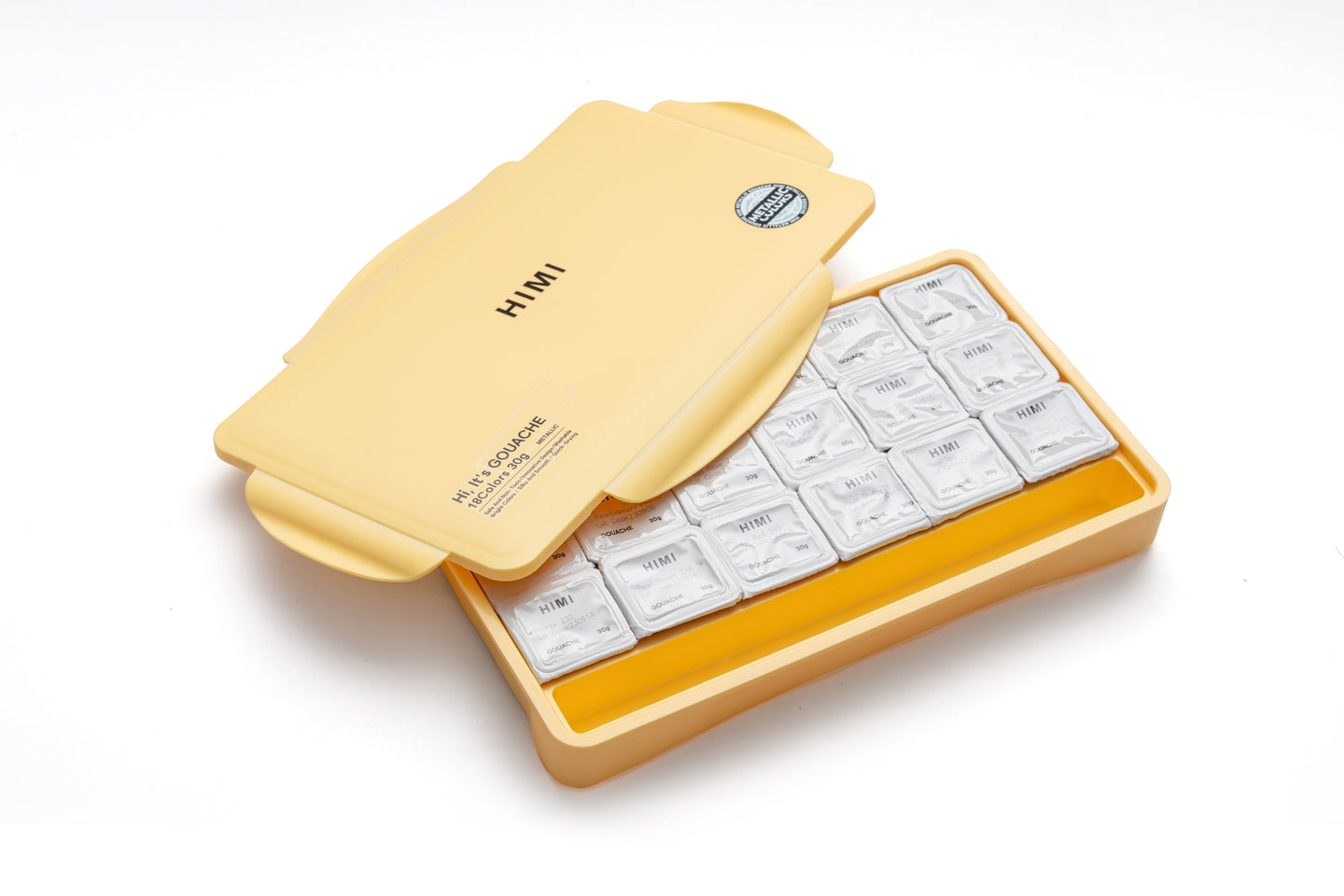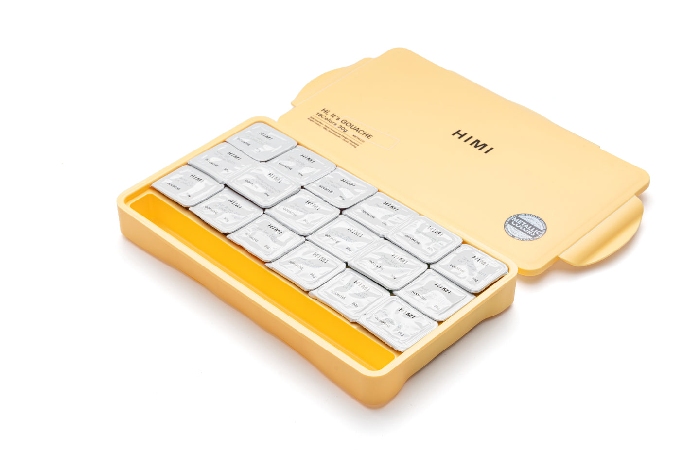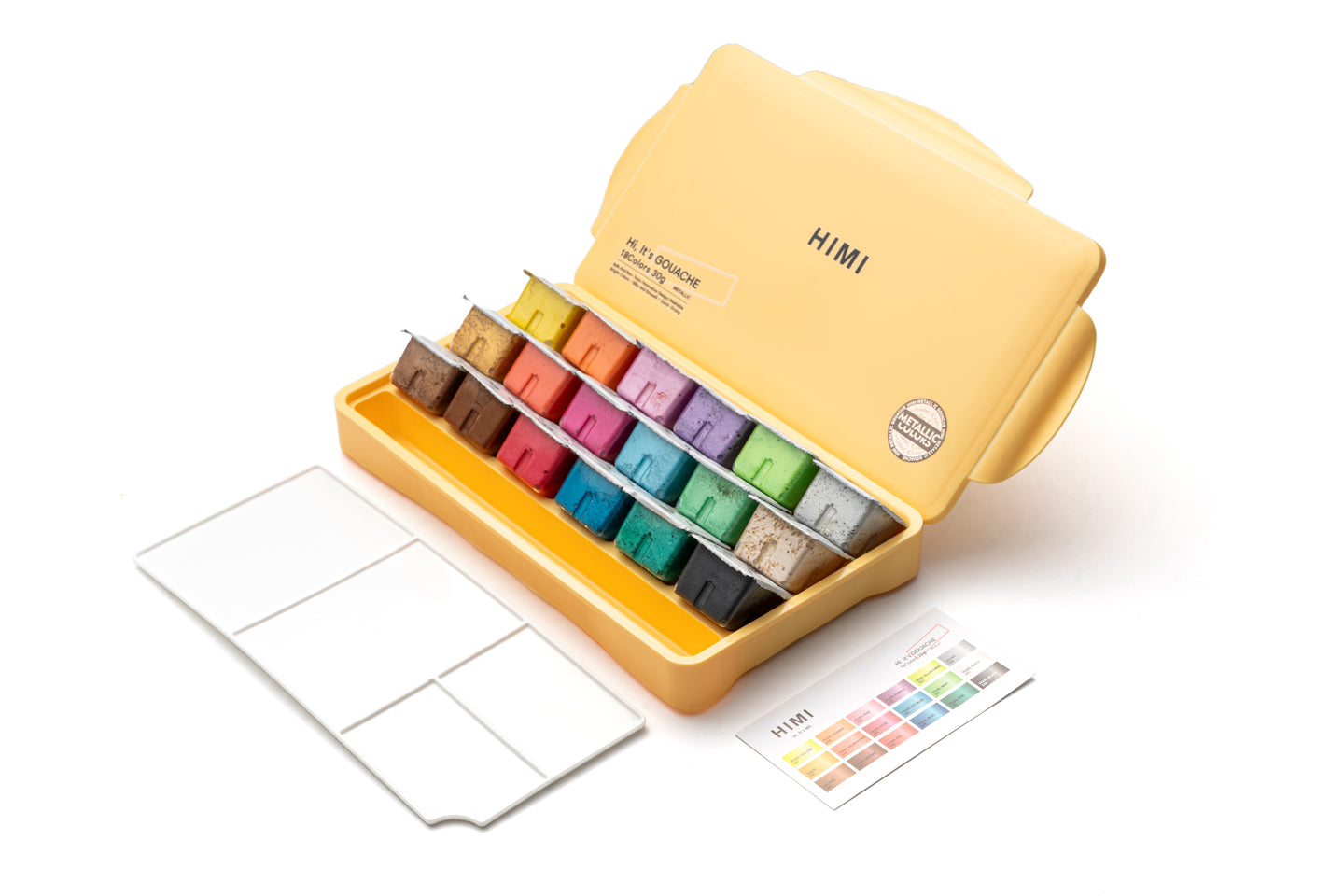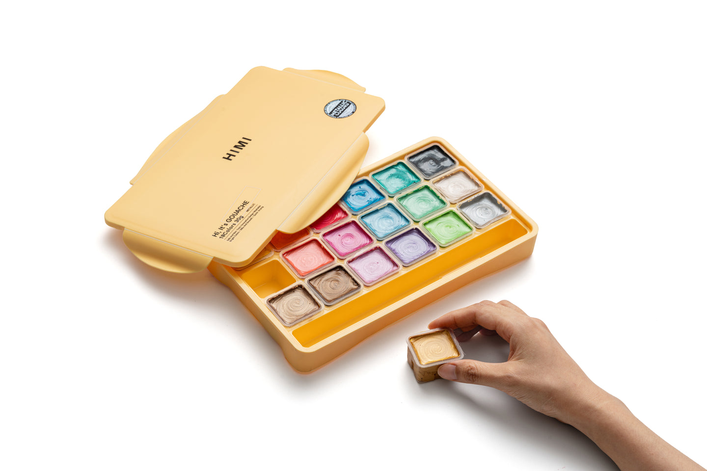 HIMI Jelly Cup Gouache Set 18 Paint Colours, 3 Brushes, Paint Pallete, Yellow Case Metallic, Add Water To Reactivate, Smooth, Rich Colours, Gift, Artist Art Supplies, Large Scale Art Work Fine Details