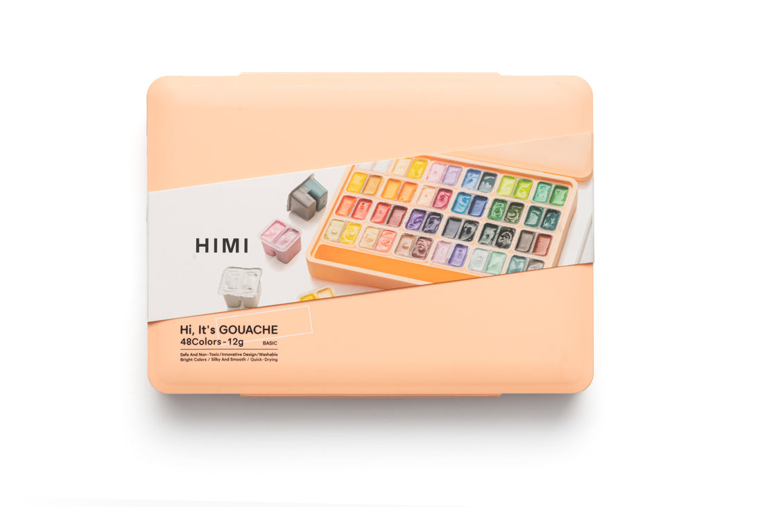 48 vibrant colours in a playful peach fuzz case, opaque gouache paints, ready for beginners and creative explorers alike. Paint without pressure. The HIMI Twin Cup Gouache Set brings together 48 rich colours that stay bright and matte, never chalky or dull. Each colour is made with peach gum and fine pigments for a silky flow and smooth coverage on paper. Gouache reactivates with water, so nothing goes to waste. Just add a drop to bring colours back to life. Easy to clean, safe, and non-toxic, this set is as practical as it is inspiring. Tip: Pair this set with the HIMI Spray to keep paints moist and fresh for longer sessions. The compact case keeps everything organised and portable, whether you’re painting at home, in class, or on the go. Grab your brush and you can start creating right away. Suitable for artists of every level who want to add colour to their world.