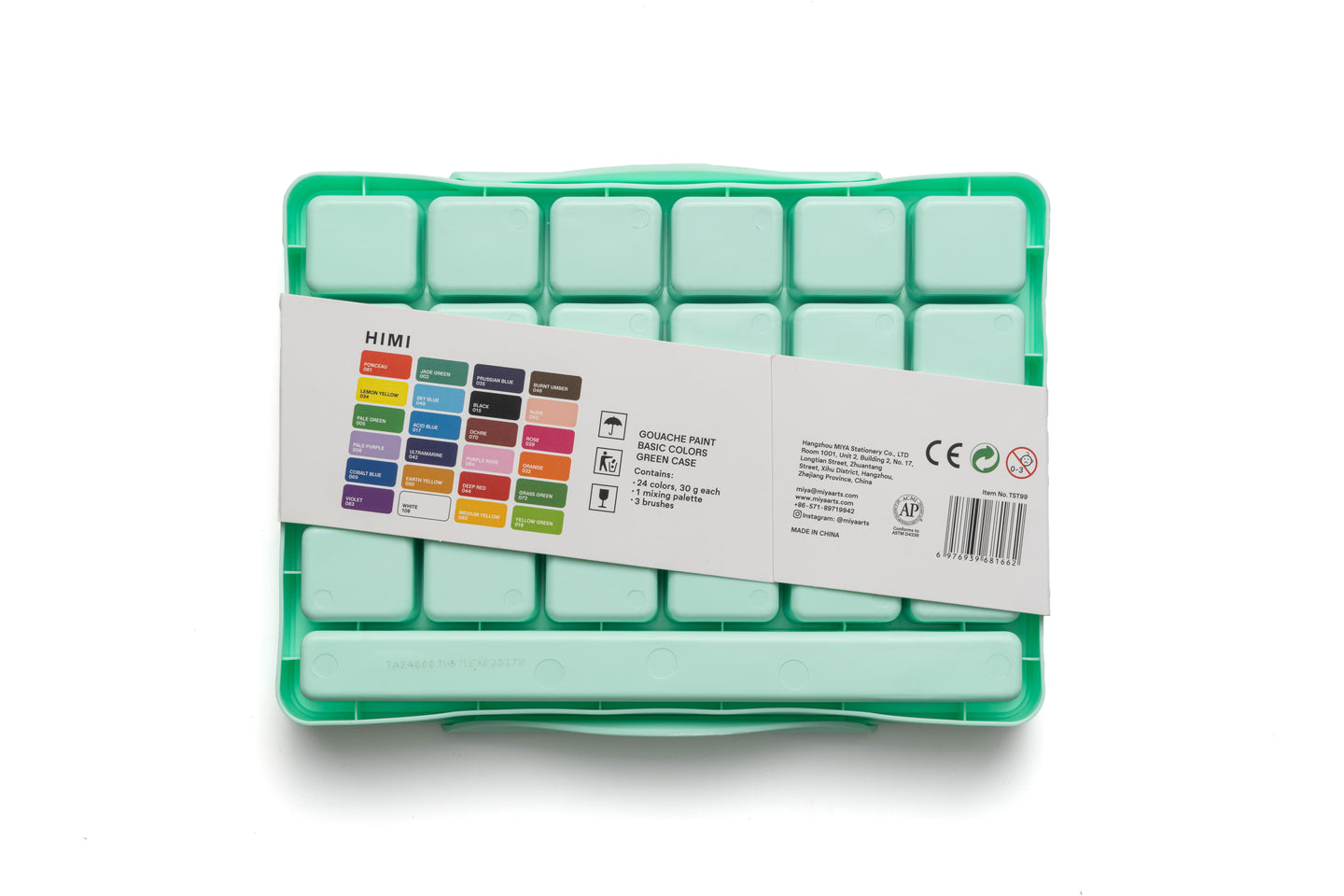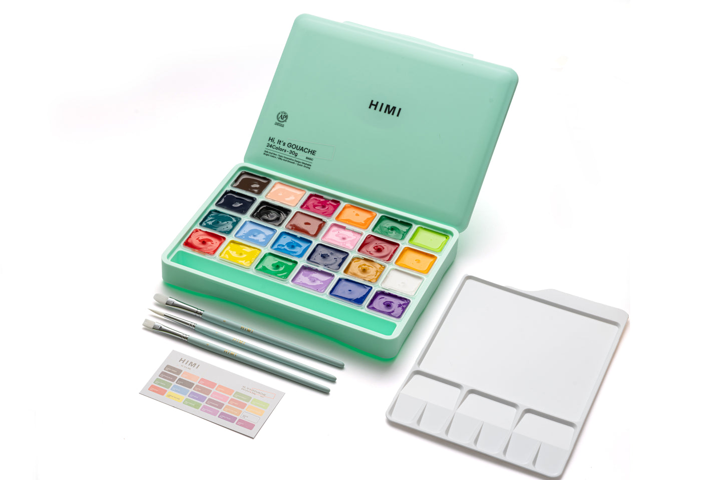 HIMI Jelly Cup Gouache Set 24 Paint Colours, 3 Brushes, Paint Pallete, Green Case, Add Water To Reactivate, Smooth, Rich Colours, Gift, Artist Art Supplies, Large Scale Art Work To Fine Details