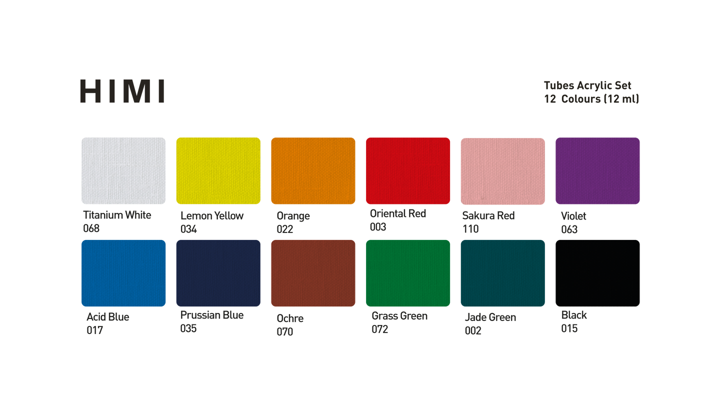 12 acrylic colours in tubes, ready for creative hands and everyday art. The HIMI Acrylic Set is made for everyone who enjoys painting, from art lovers and hobby makers to students and decorators. The paints have a smooth, creamy texture, strong coverage, and a natural gloss finish that keeps colours bright and lively after drying. They work well on paper, canvas, wood, and fabric, giving plenty of freedom for experiments and mixed-media ideas. The paint can be thinned with water, so there’s no need for extra mediums. It dries quickly and stays permanent once dry, becoming water-resistant and long-lasting, so your artwork keeps its colour and shape over time. Compact and practical, the set of 12 ml tubes fits neatly into any art box or drawer, making it perfect for small projects or everyday creativity at home. In closed tubes the paint stays moist and fresh for long. Bright, glossy, and simple to use, classic HIMI acrylics formula made for creative hands.