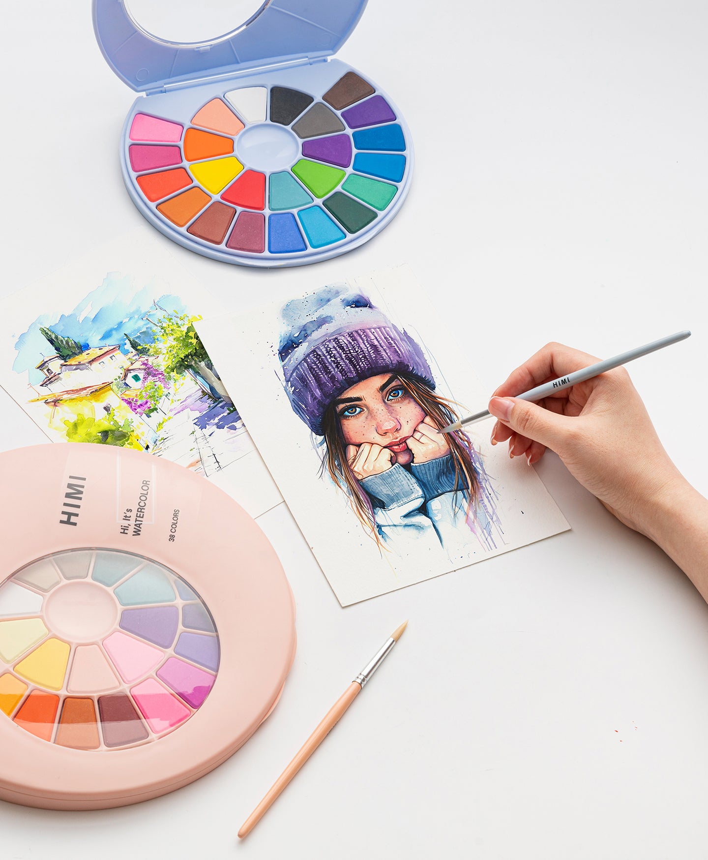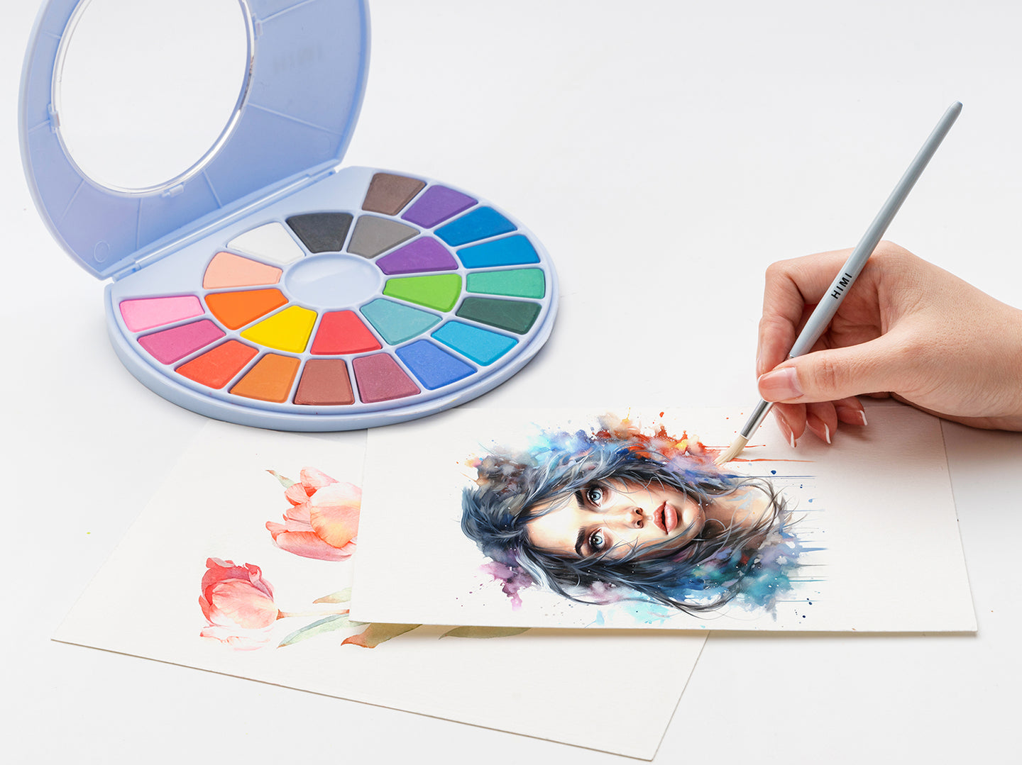 HIMI Solid Watercolour Set 24 Colours In Pans, Brush, Blue Case, Opens Like Makeup Palette, School Art, Teen Sketching, Bold Experiments, Watercolor Supplies Kit, Portable, Beginner Hobby, Gift