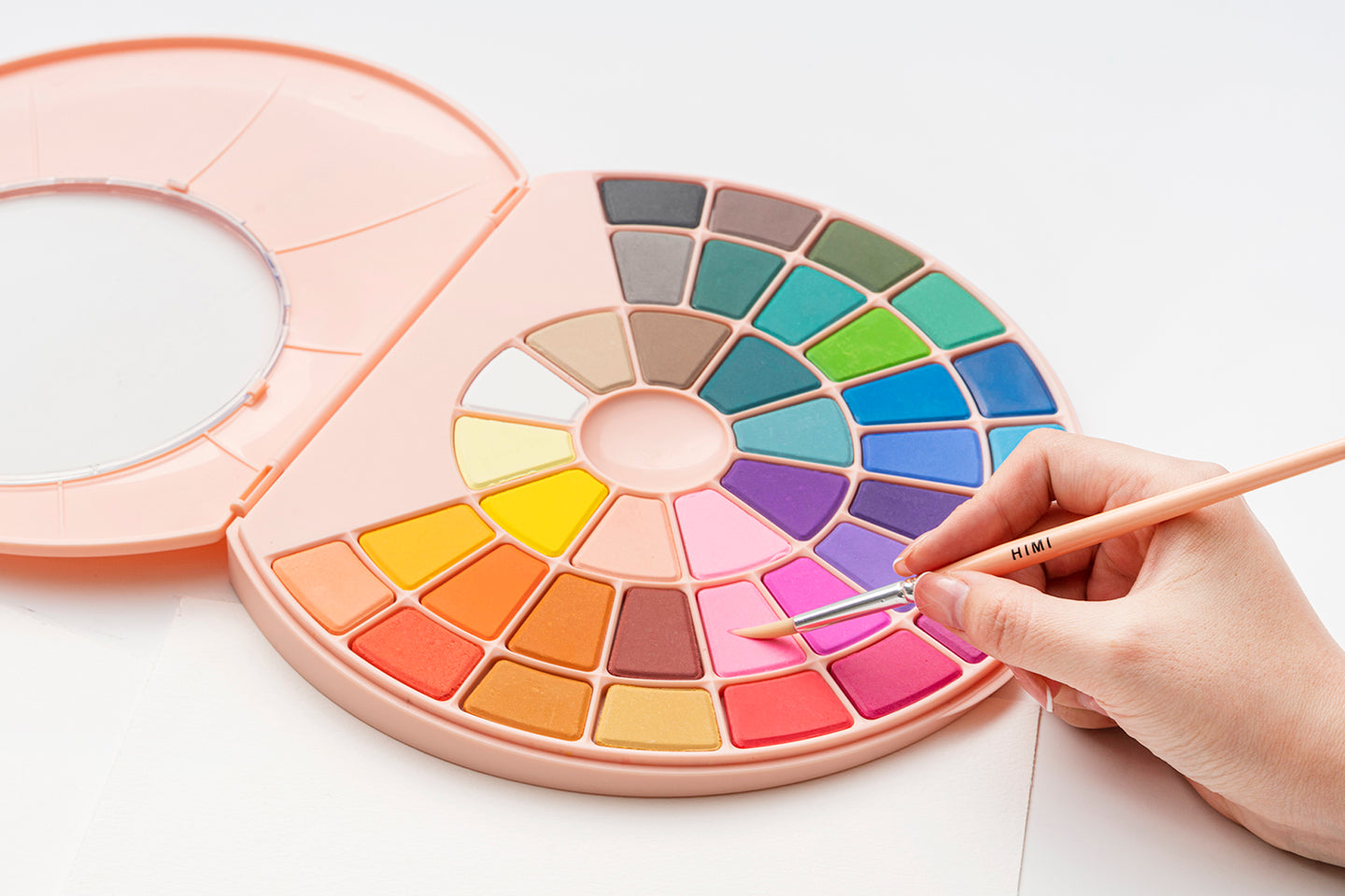 HIMI Solid Watercolour Set 38 Colours In Pans, Brush, Pink Case, Opens Like Makeup Palette, School Art, Teen Sketching, Bold Experiments, Watercolor Supplies Kit, Portable, Beginner Hobby, Gift