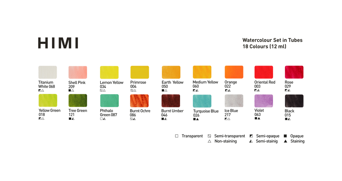 18 watercolour shades in tubes, ready for painting, mixing, and refilling your favourite palettes. Paint your way with the HIMI Watercolour Tube Set. With 18 basic studio colours, this set gives you the freedom to use as much paint as you need, straight from the tube or diluted for soft transparent washes. Each paint is made with fine pigments and gum arabic, giving smooth flow, bright tones, and colours that mix cleanly and stay beautiful after drying. The paints have good light resistance, so your artwork keeps its colour over time. The 12 ml tubes are easy to store and perfect for refilling half-pans, palettes, or travel sets. Use them at home, in class, or in the studio. Simple, flexible, and made for joyfull painting. Reliable, expressive, and full of colour made for artists who enjoy classic watercolour painting.