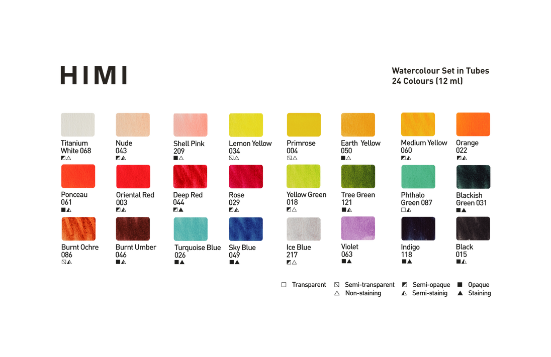 24 watercolour shades in tubes, ready for painting, mixing, and refilling your favourite palettes. Paint your way with the HIMI Watercolour Tube Set. With 24 studio colours, this set gives you the freedom to use as much paint as you need, straight from the tube or diluted for soft transparent washes. Each paint is made with fine pigments and gum arabic, giving smooth flow, bright tones, and colours that mix cleanly and stay beautiful after drying. The paints have good light resistance, so your artwork keeps its colour over time. The 12 ml tubes are easy to store and perfect for refilling half-pans, palettes, or travel sets. Use them at home, in class, or in the studio. Simple, flexible, and made for joyfull painting. Reliable, expressive, and full of colour made for artists who enjoy classic watercolour painting.