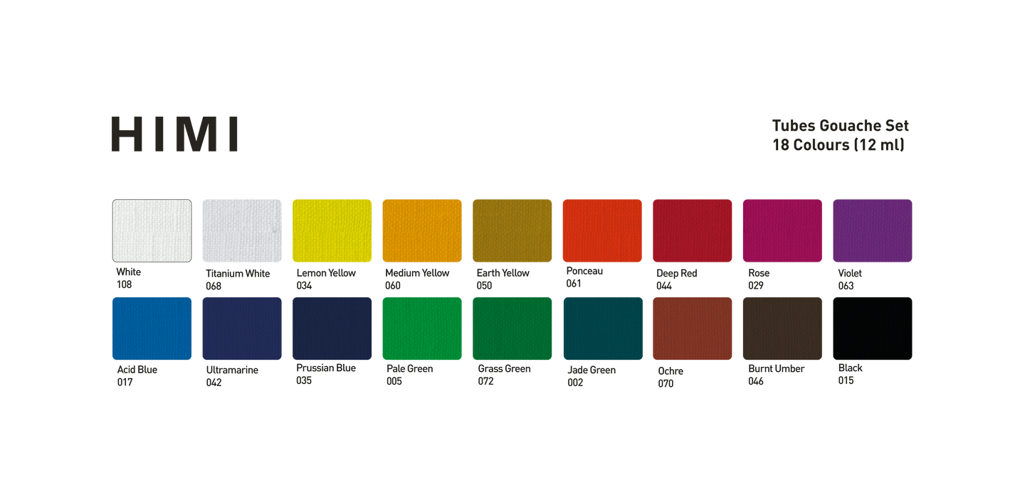 The original HIMI jelly gouache - now in tubes. 18 rich colours for creative practice and playful experiments. Experience the famous HIMI jelly gouache, loved for its smooth matte finish and vibrant pigments, now in a classic tube format. The same peach gum and rich pigments ensure silky flow, strong coverage, and colours that stay bright without whitening or dullness. Packed in 12 ml tubes, this version offers a longer shelf life and a more compact design than the original jelly cups: easy to store, take on the go, or use in the classroom. Gouache reactivates with water, so nothing goes to waste. Safe and non-toxic, it also cleans easily from hands and clothes. Perfect as a beginner’s first gouache set, or for anyone who wants the unique HIMI jelly gouache experience in a handy, squeeze-and-go format. Tubes can also be used to refill your HIMI jelly cups when colours run low.