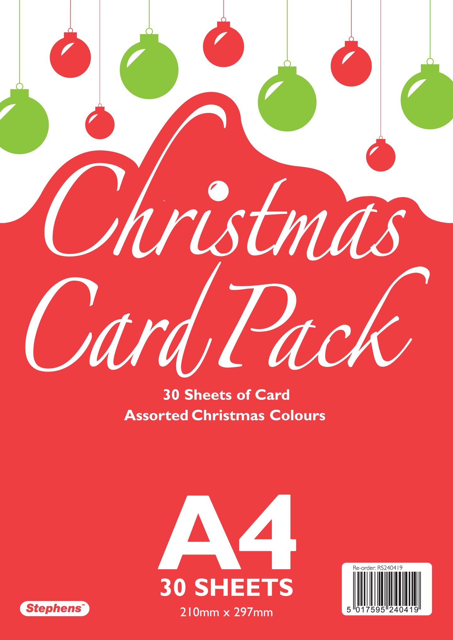 A pack of 30 sheets of A4 card in Christmas colours. 30 sheets of themed coloured card ideal for anything to do with Christmas. Ideal for posters models and paper crafts. Perfect for making Christmas cards and decorations.