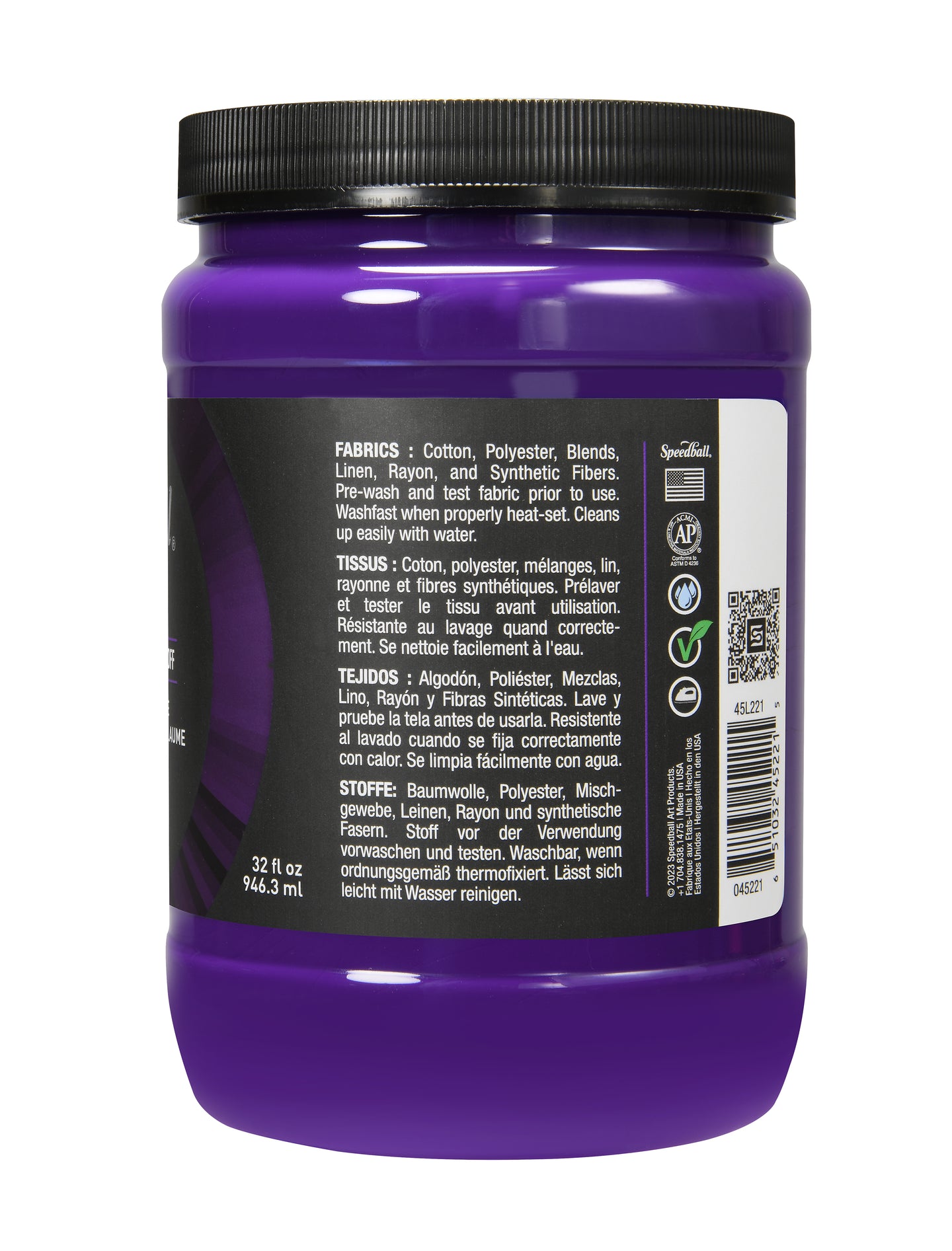 Speedball Flex™ Fabric Screen Printing Inks are an advanced water-based ink designed to be flexible across a variety of materials. Uniquely formulated to deliver the best results! The ink delivers bold, rich colour whether printing on light or dark fabrics.Can be used on fabric including cotton, polyester, rayon, and synthetic fibres, while resisting cracking or peeling when fabric is pulled or stretched. Ink maintains rich, vibrant colour when properly heat set. Speedball FLEX Inks are not pure process colours. This guarantees the highly opaque performance but will require artists to experiment when developing their own custom palettes.