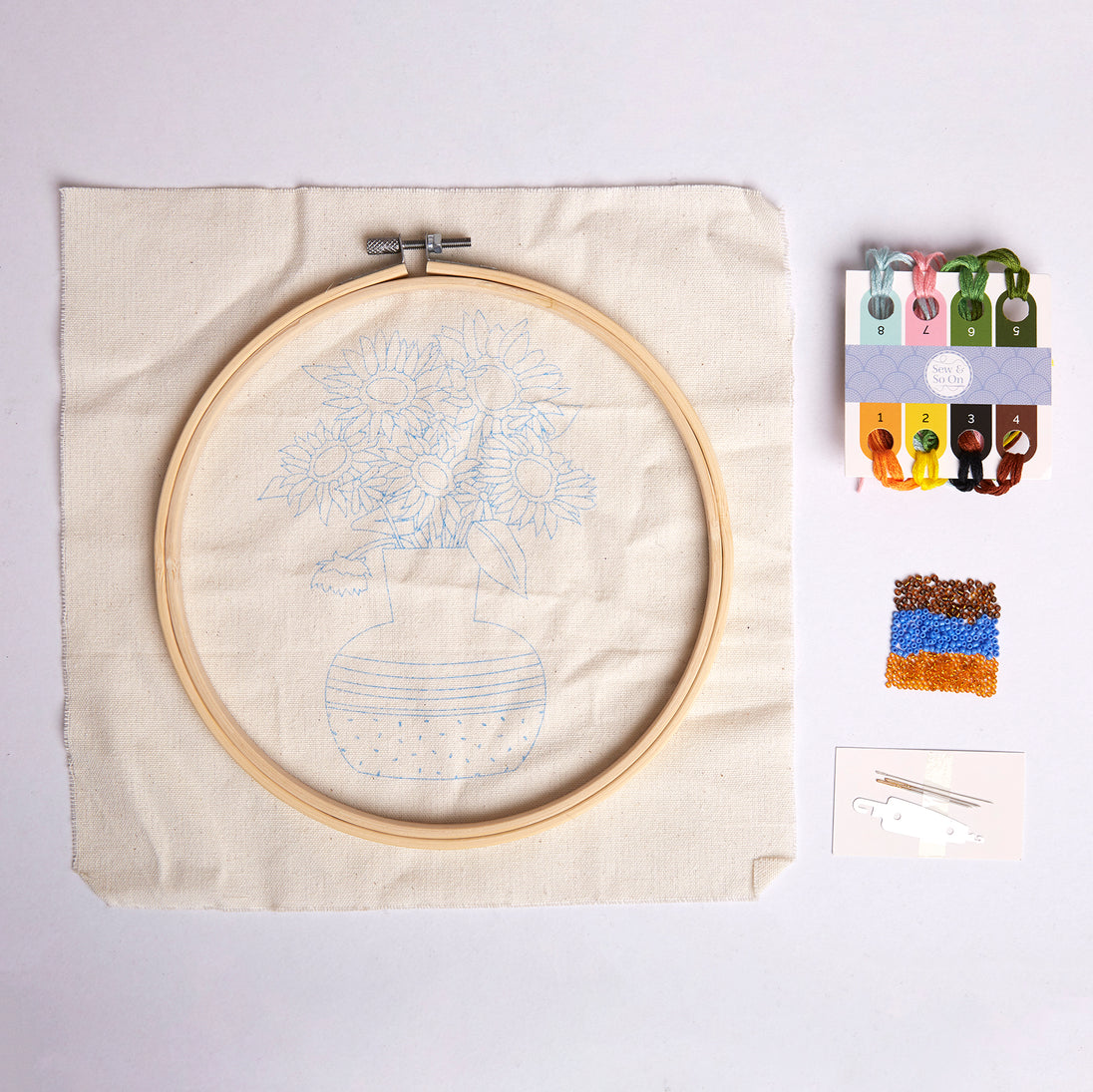 Premium Sew and So On kits are perfect for beginners or experienced sewers alike. This kit includes everything required to complete a stylish Sunflowers embroidery design that can be displayed in the bamboo hoop included.