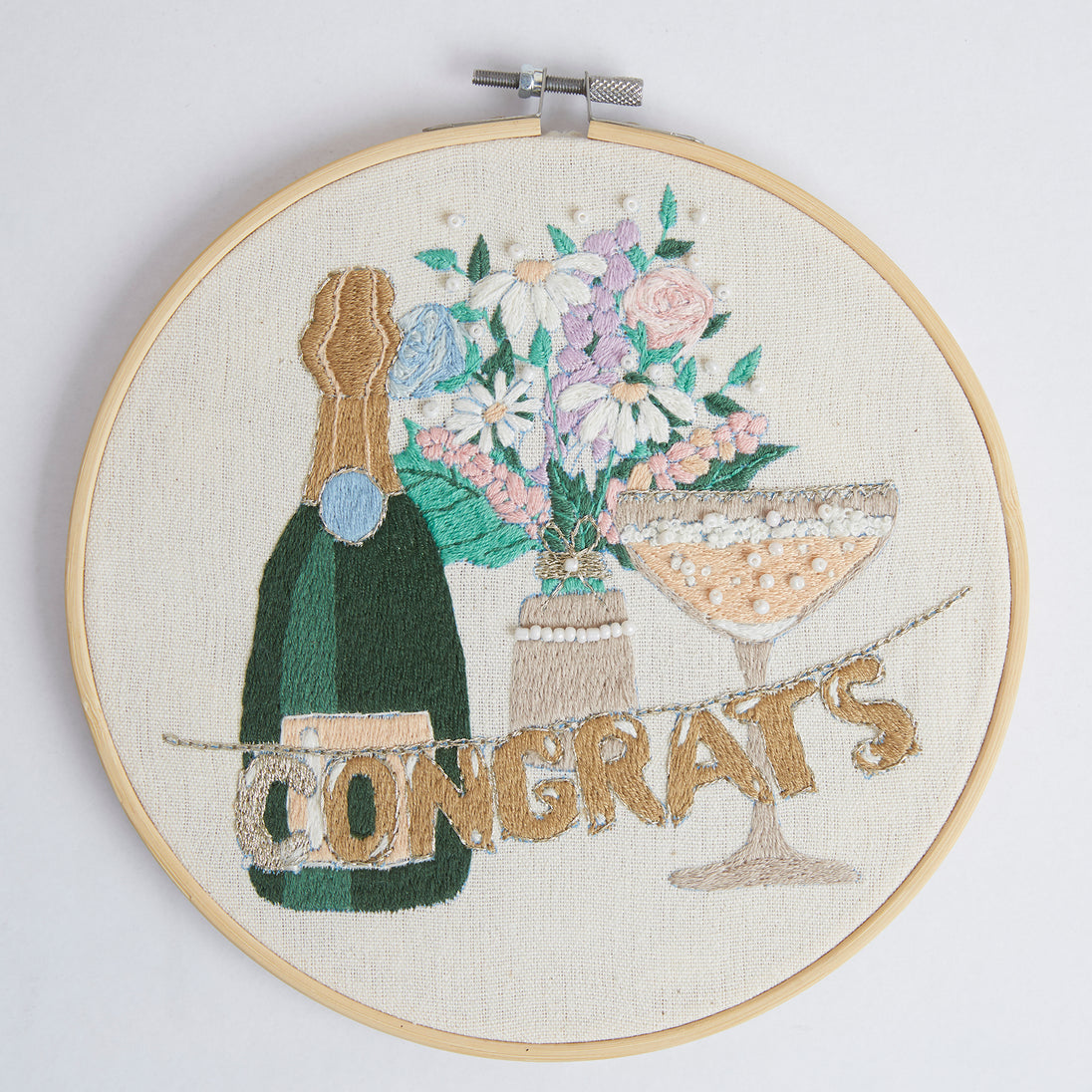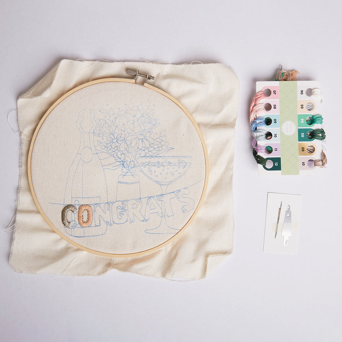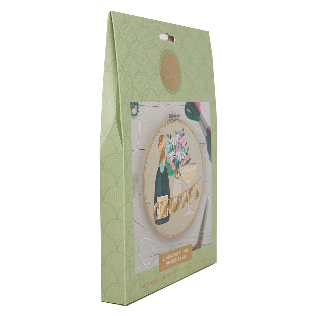 Premium Sew and So On kits are perfect for beginners or experienced sewers alike. This kit includes everything required to complete a stylish 'Congratulations' embroidery design that can be displayed in the bamboo hoop included.