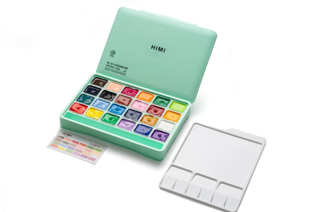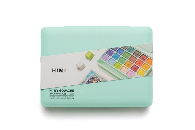 HIMI Jelly Cup Gouache Set 24 Paint Colours, Green Case, Add Water To Reactivate, Smooth, Rich Colours, Gift, Artist Art Supplies, Large Scale Art Work To Fine Details, Ready To Use Gouache Colors