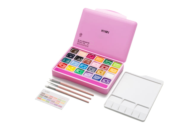 HIMI Jelly Cup Gouache Set 24 Paint Colours, 3 Brushes, Paint Pallete, Pink Case, Add Water To Reactivate, Smooth, Rich Colours, Gift, Artist Art Supplies, Large Scale Art Work To Fine Details