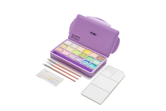 18 soft pastel colours in a purple case, opaque gouache paints with 3 handy brushes, ready for beginners and creative explorers alike. Paint with tenderness. The HIMI Jelly Cup Gouache Pastel set offers 18 soft shades...Regular price £29.99 -
