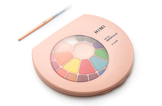 HIMI Solid Watercolour Set 24 Colours In Pans, Brush, Pink Case, Opens Like Makeup Palette, School Art, Teen Sketching, Bold Experiments, Watercolor Supplies Kit, Portable, Beginner Hobby, Gift
