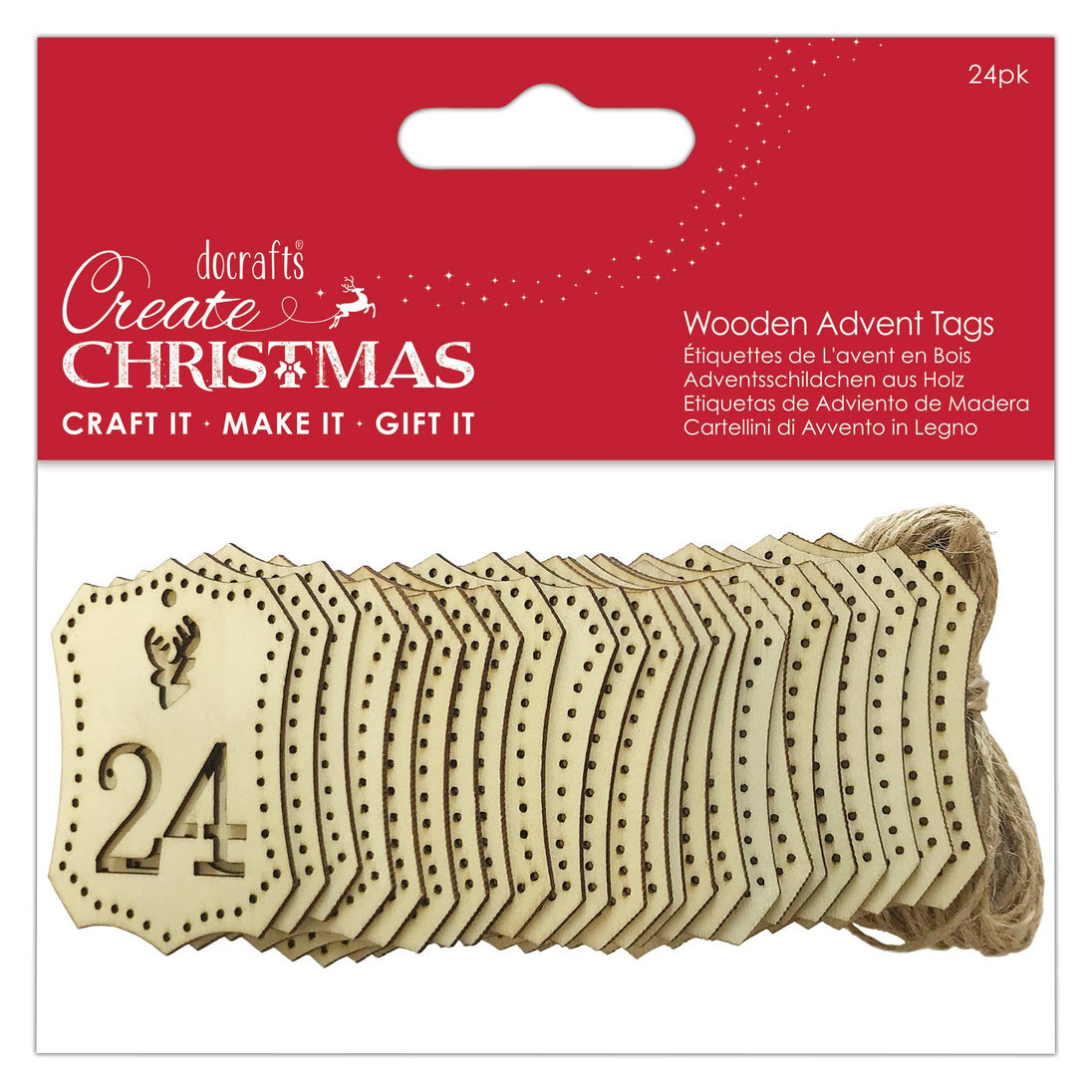 CONTENTS The pack contains x24 wooden advent tags featuring a dotted border and cut out number. String is also included for hanging.