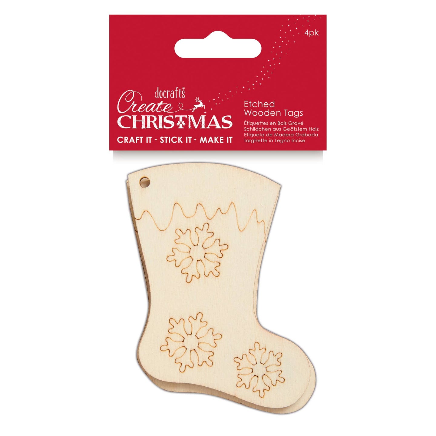 USE – Add these delightfully festive stocking tags to your craft projects and creations this Christmas. They are the perfect finishing touch to your makes. Get truly festive with your Christmas crafting this year. PERSONALISATION – Add a festive sentiment for your loved one this Christmas. No wrapped gift is complete without a tag for your personal message, and to be sure it will be received by correct recipient. EMBELLISH – Personalise your gift tags by adding a pop of colour. Use paint or markers and a dash of festive glitter for a touch of sparkle and shine. You can colour co-ordinate with your gift wrap. IDEAL – These wooden tags can also be used for scrapbook designs, handmade cards, decoupage, gift wrapping, home décor and more. The creative design possibilities are endless. CONTENTS – The pack contains x4 natural wooden gift tags in a stocking design.