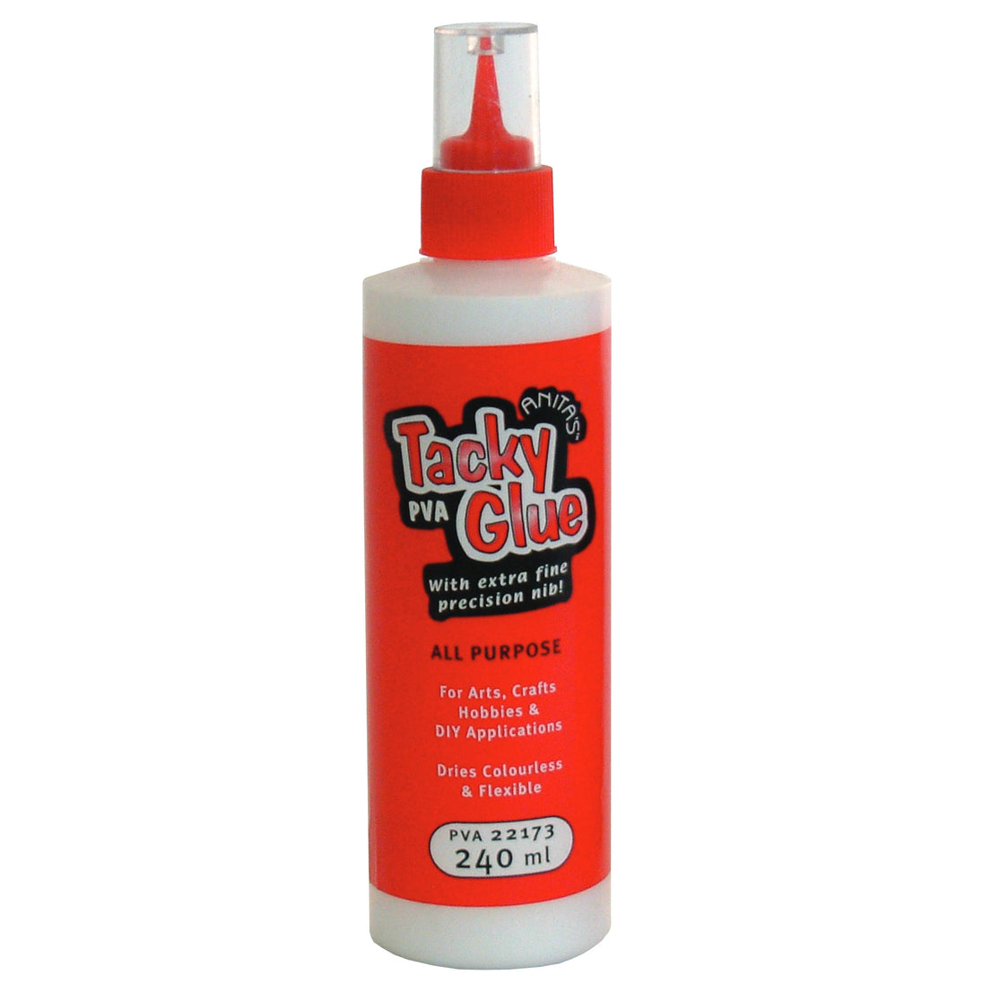 Anitas Tacky Poly Vinyl Acetate Glue is perfect for crafting. Its versatile formula and precision nib are ideal for both detailed and general arts and craft projects hobbies and even some DIY. Dries colourless and flexible. Use it for bonding paper card and non-washable fabric projects wood craft foam and more. Directions for Use: There is no need to trim the precision nib before use unless a large nib size is preferred. Shake bottle so that glue flows into the nib. Contains 120ml