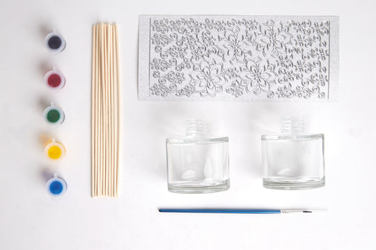 Painting on glass is an ever popular pastime. This superb kit offers an excellent introduction to glass painting and uses silver self adhesive outlines and glass paints to create two decorative glass fragrance bottles. Reed diffuser...Regular price £19.99 -