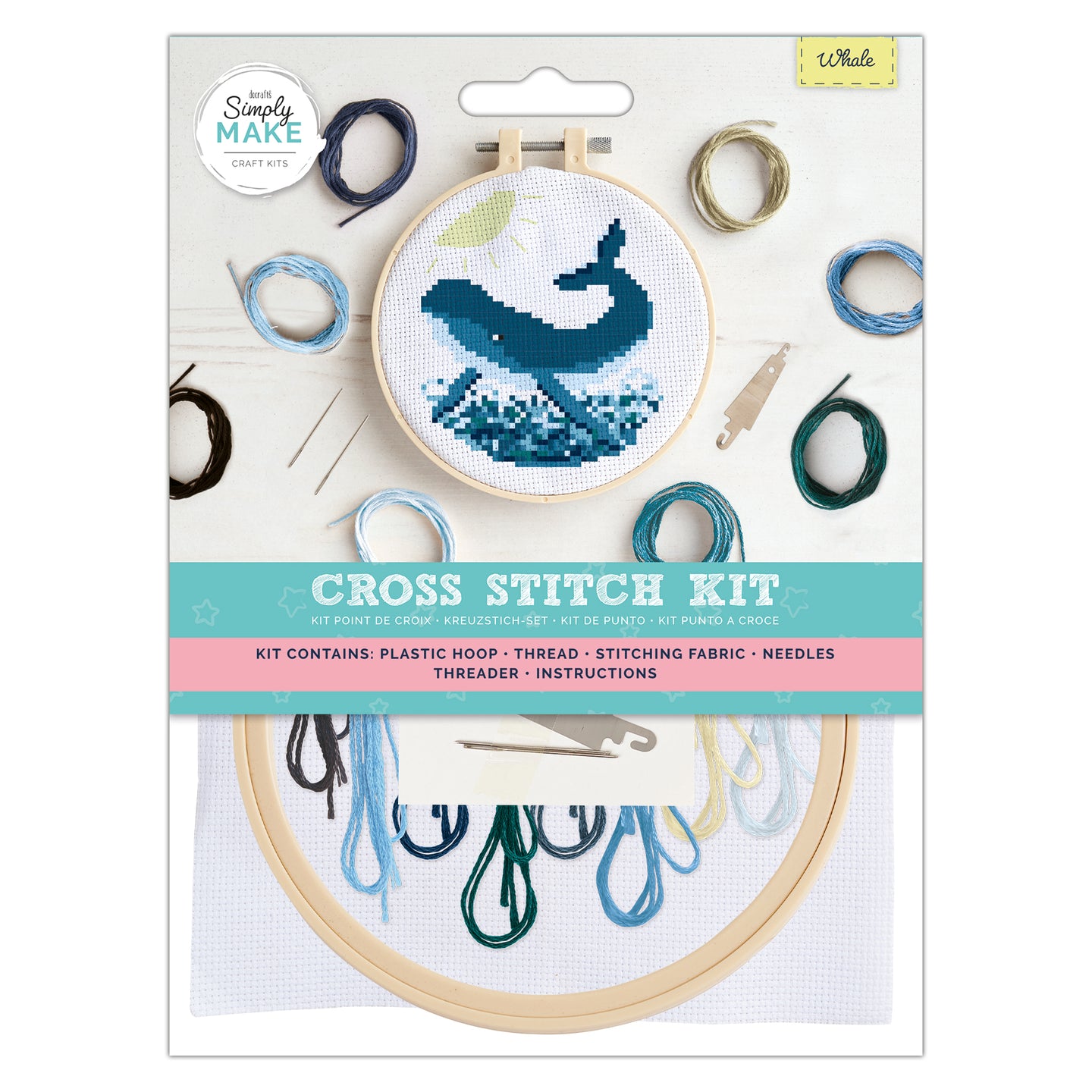 Simply Make Cross Stitch Kit - Whale Design for Kids and Adults, Including Hoop, Embroidery Thread, Fabric and Needle - Perfect for Adult Crafts and Beginners - Starter Cross Stitch Craft Kit