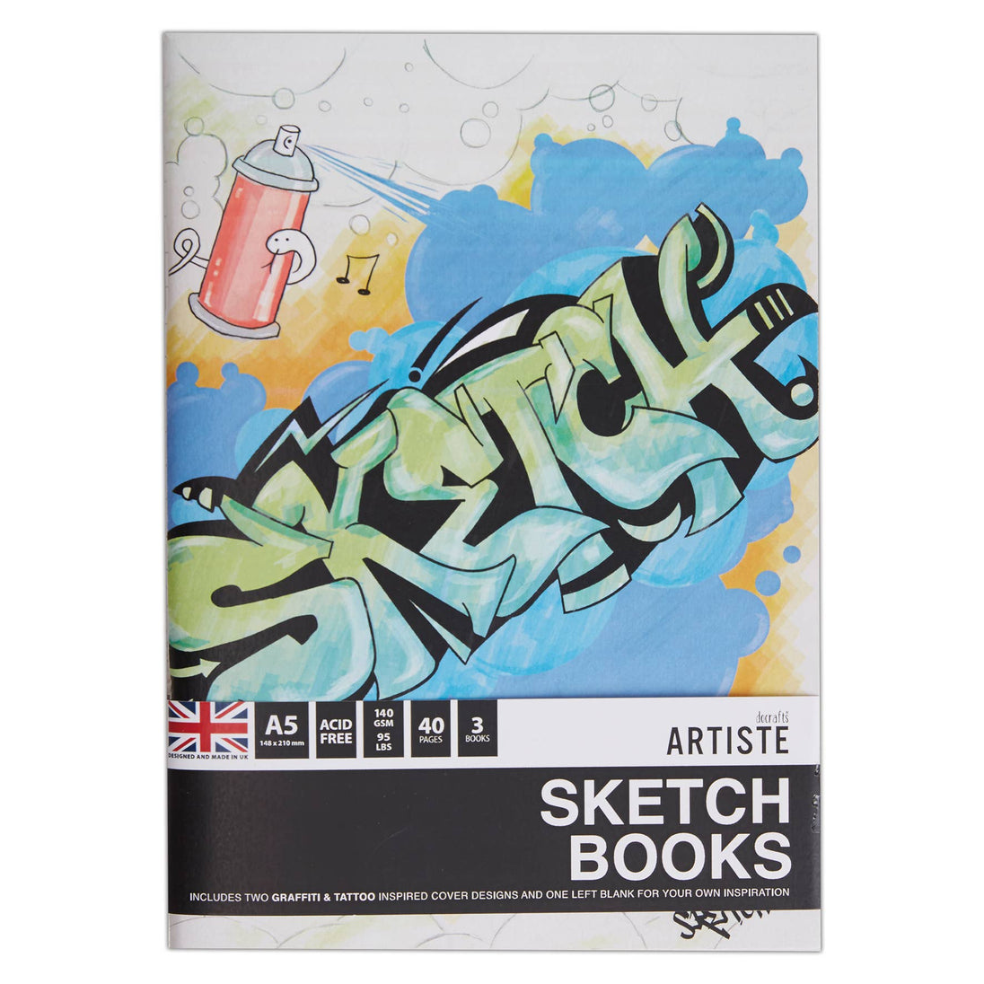 DESIGN Two graffiti inspired notebook designs, one left blank for your own personalised masterpiece. Use with wet or dry techniques that include watercolours, acrylics, oil painting, pens, and ink. Sketchbooks are designed for everyday use.
