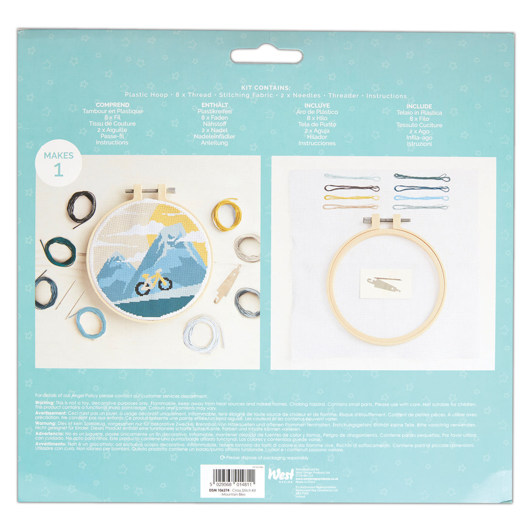 This kit contains everything that you need to create a great finished project in a Mountain Bike. Includes instruction and cross stitch chart,200mm plastic hoop, up to 8 x threads,aida fabric, 2 x needles, and threader.
