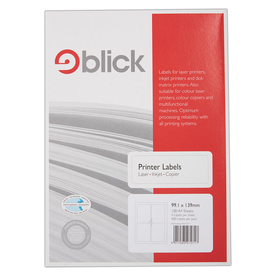 Blick Labels, White, 4 Per Sheet 100 Sheets, Rectangular, 99.1mm x 139mm, 400 Labels, For Home, Office, Family, School