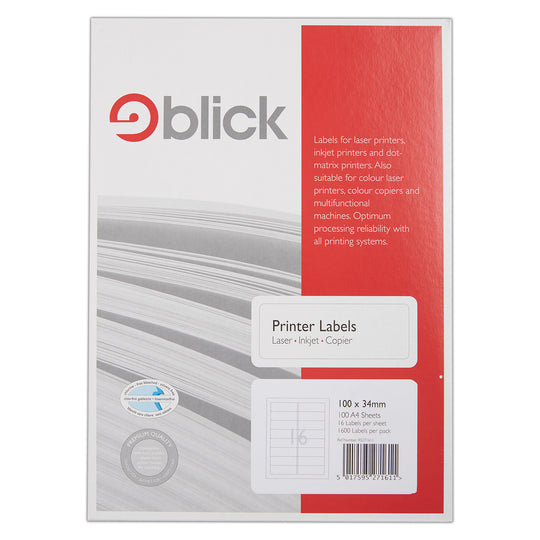Blick Labels, White, 16 Per Sheet 100 Sheets, Rectangular, 100mm x 34mm, 1600 Labels, For Home, Office, Family, School