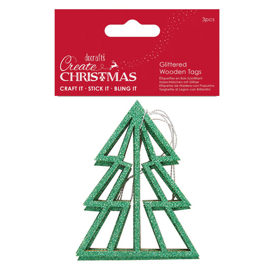 Create Christmas Glittered Wooden Tags, Tree, Green, Pack of 3, Craft Supplies for Home Christmas Craft and Craft Projects, Ideal for Festive Crafts for Kids and Adults